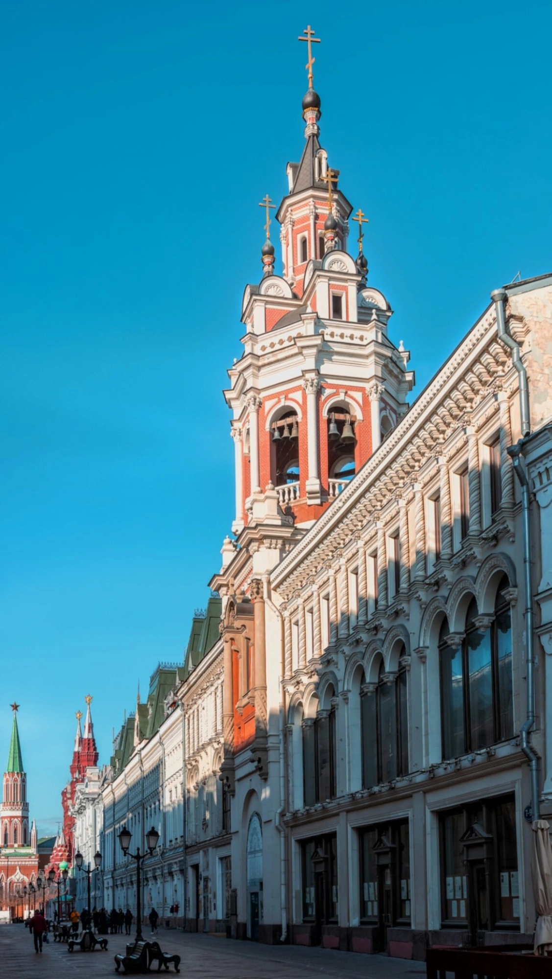 На представленной фотографии запечатлён живописный вид одной из древнейших улиц столицы — Никольской. Композиционным центром снимка является величественная колокольня Заиконоспасского ставропигиального мужского монастыря, известного также как Спасский монастырь, что на Никольском крестце. Многоярусная колокольня, выполненная в изящных формах русского барокко, устремляется своими золочёными главами к яркому синему небу, символизируя духовное устремление к горнему миру.