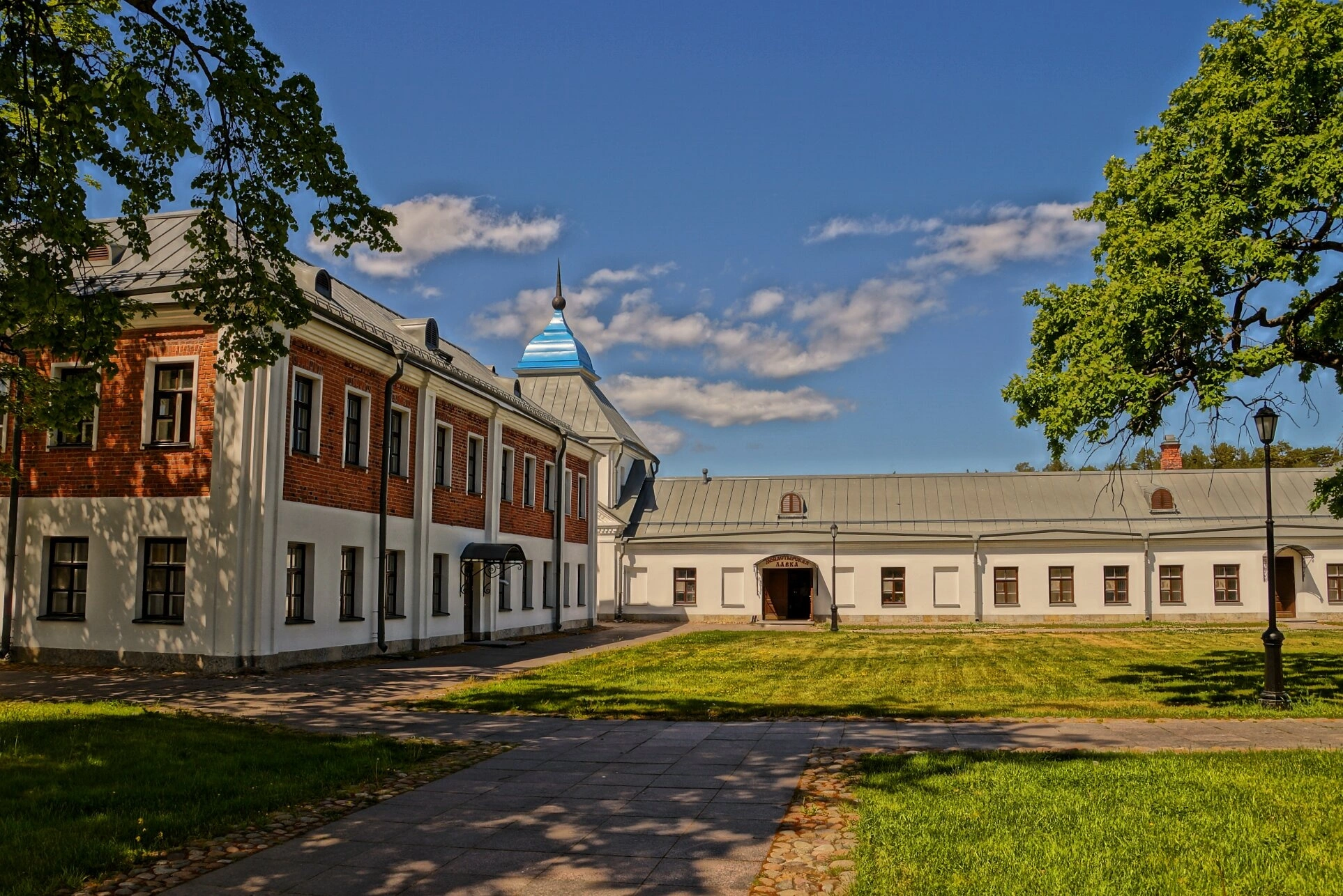 На переднем плане открывается ухоженная территория монастыря с зелёным газоном и аккуратной дорожкой, ведущей к храмовым и братским корпусам. Слева изображено протяжённое каменное здание с побелёнными стенами, украшенными кирпичным декором, и высокой серой кровлей, увенчанной небольшой главкой с синей маковкой, характерной для русского церковного зодчества. Справа виден ещё один корпус с многочисленными окнами, также покрытый серой крышей.