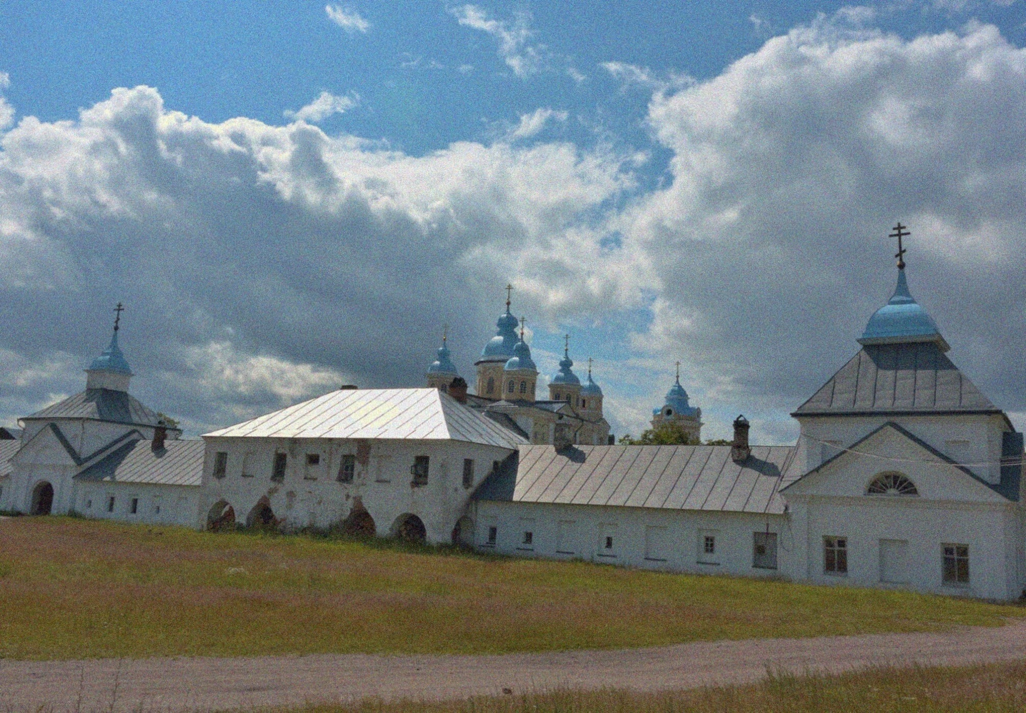 Фотография передаёт умиротворённую атмосферу этого святого места: монастырь окружён скромной северной природой, грунтовая дорога ведёт к его вратам, а над ним простирается высокое небо с облаками, создавая образ духовного убежища и молитвенного покоя.