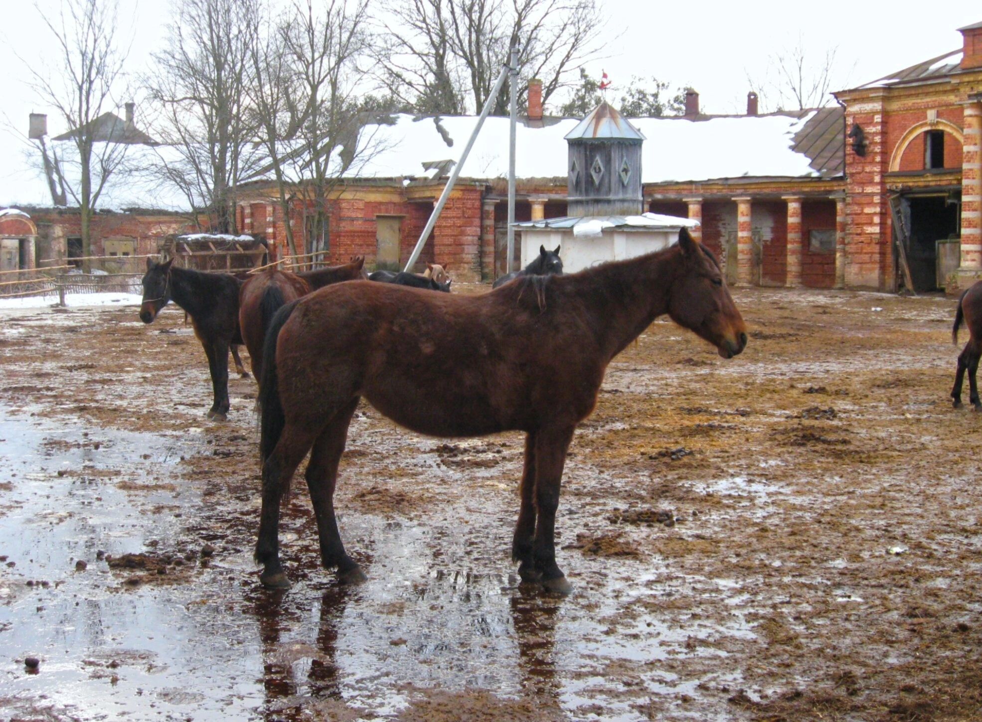 На переднем плане изображены несколько лошадей тёмно-коричневой масти, мирно стоящих на утоптанной земле конюшенного двора. Одна из лошадей, расположенная ближе к зрителю, повёрнута боком к объективу, что позволяет рассмотреть её статную фигуру. Животные гармонично вписываются в окружающий архитектурный ландшафт, создавая единый образ исторической усадьбы.