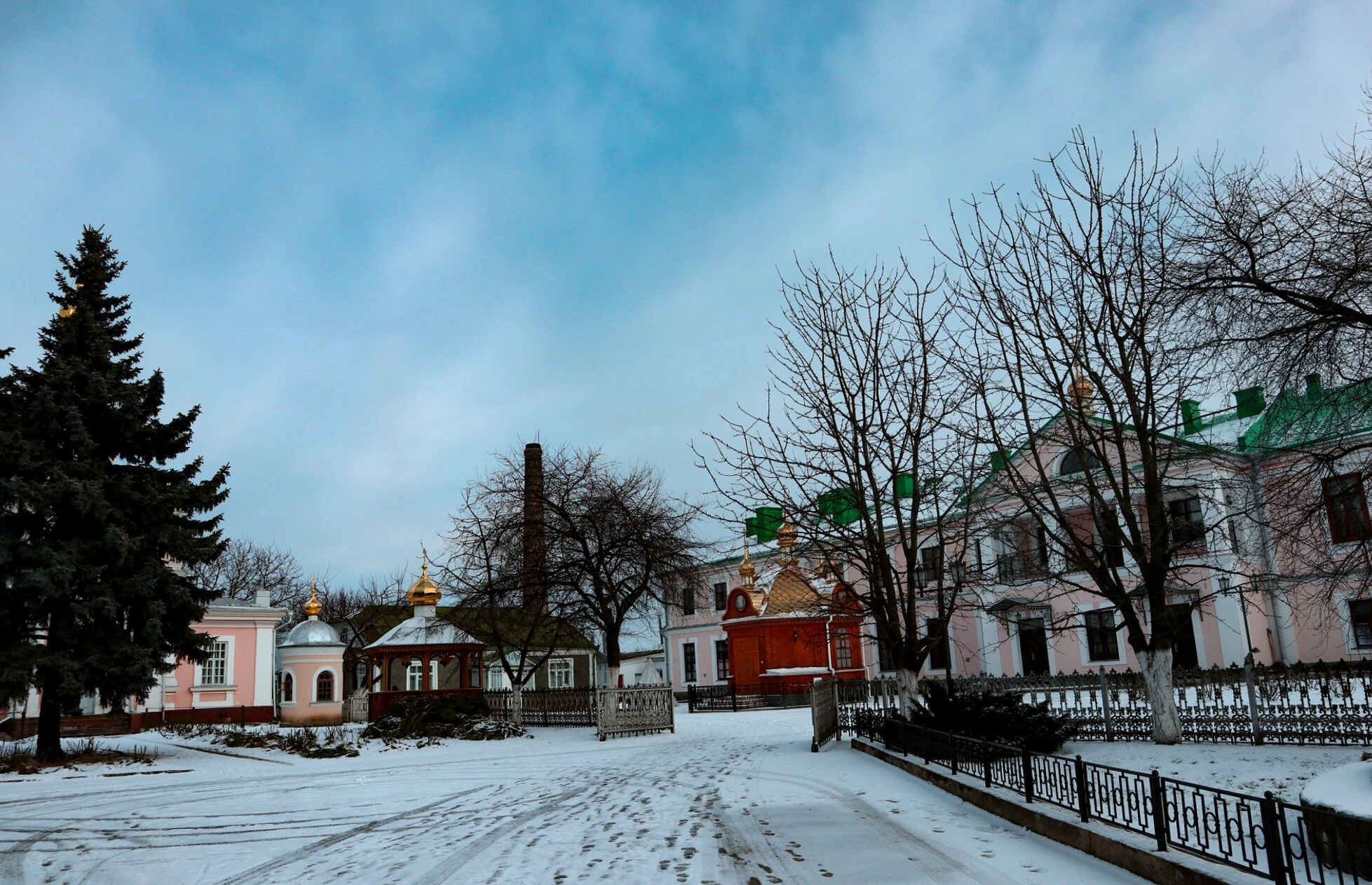 С левой стороны возвышается прекрасная ель, укрытая снежным покровом, рядом с которой находится малый храм с златоверхим куполом, сияющим даже в пасмурный день. Справа виднеются монастырские корпуса с характерными для церковной архитектуры зелёными кровлями и розоватыми фасадами. Ограда вдоль зданий подчёркивает уединённый характер обители, предназначенной для иноческих подвигов.