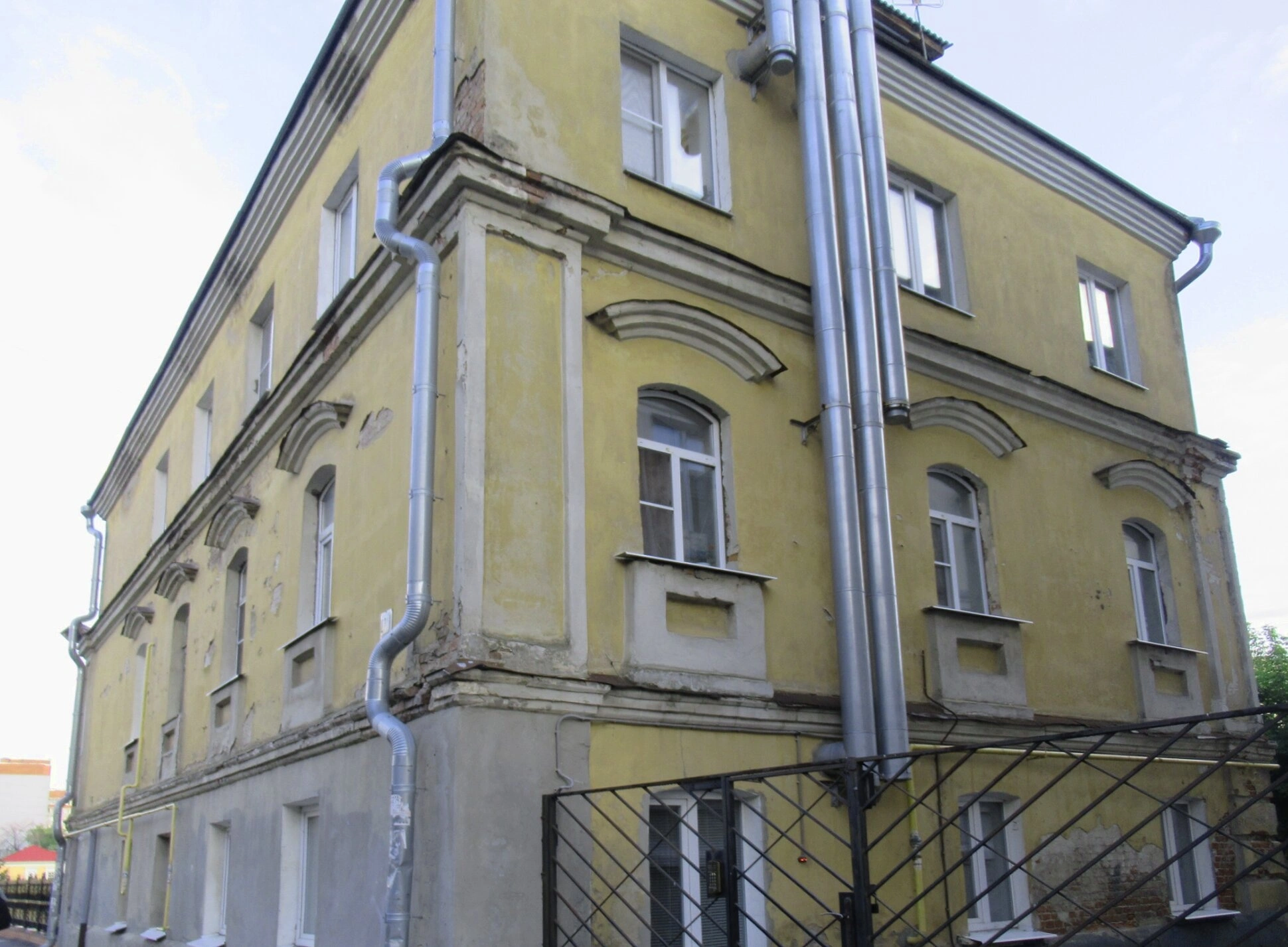 На представленной фотографии запечатлён один из корпусов исторического Казанского Явленского женского монастыря, расположенного в городе Рязани. Двухэтажное здание, выдержанное в канонах архитектуры XIX столетия, обладает характерным для церковных построек того периода строгим, но благолепным обликом. Фасад жёлтого цвета, местами утративший штукатурку, свидетельствует о почтенном возрасте святой обители и требует молитвенного попечения и реставрационных трудов.
