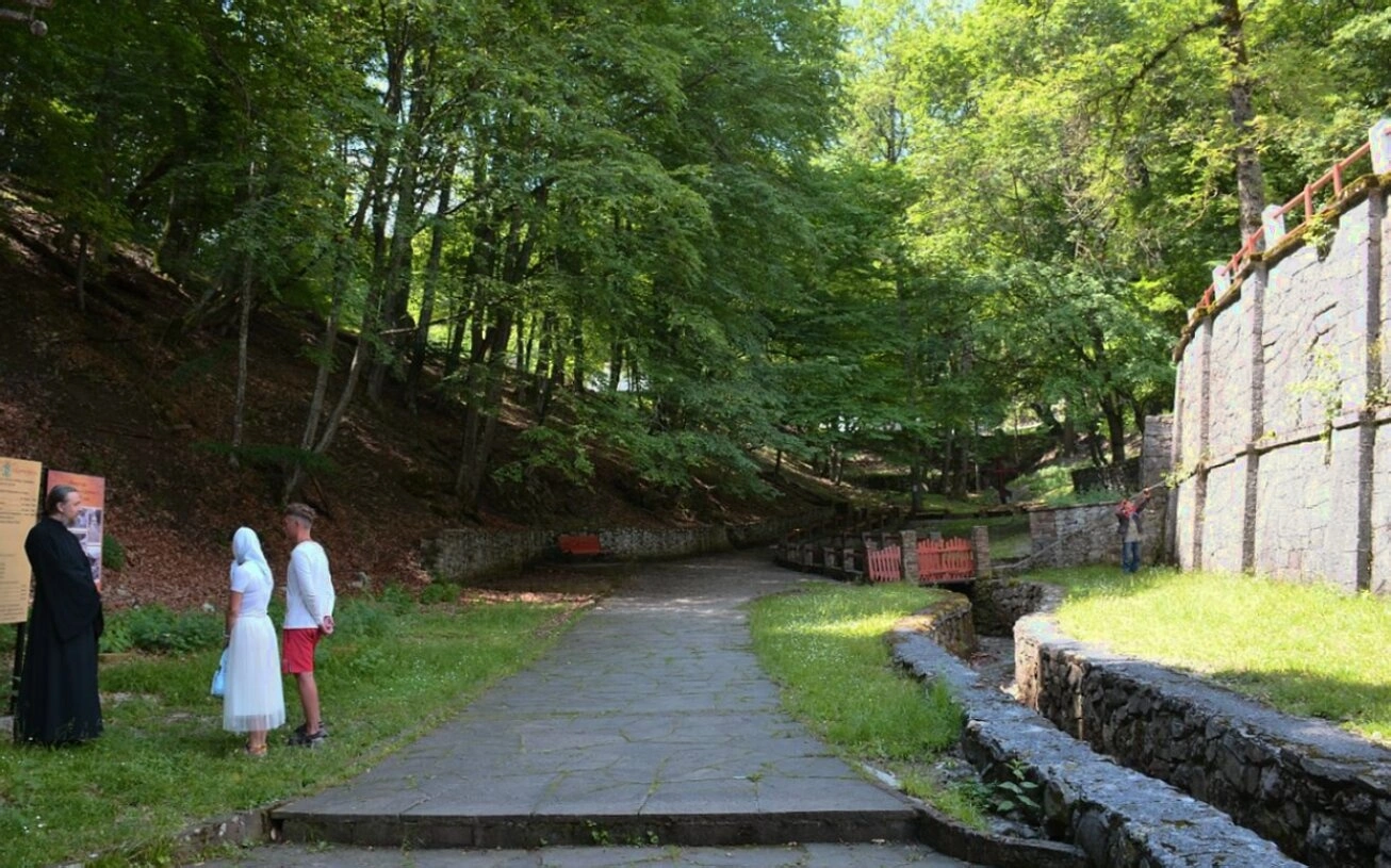 Архитектурный ансамбль монастыря, частично видный на фотографии, гармонично вписан в суровый горный ландшафт. Каменные стены и постройки символизируют твердыню православной веры, некогда утверждённой в этих местах подвигом иноков. Несмотря на сложную историю XX века, связанную с разорением и закрытием, монастырь был возрождён и вновь является действующим, привлекая множество верующих, seeking духовного утешения и исцеления у чудотворного источника.