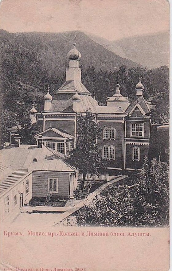 Особую историческую ценность снимку придаёт оригинальная дореволюционная подпись, выполненная в нижней части открытки: «Крымъ. Монастырь Козьмы и Даміана блись Алушты». Эта надпись указывает на то, что фотография была сделана в период расцвета обители до событий 1917 года. Монастырь был известен throughout всей Российской империи как место паломничества к чудотворному источнику, а также благодаря ежегодной ярмарке в день памяти святых 14 июля.