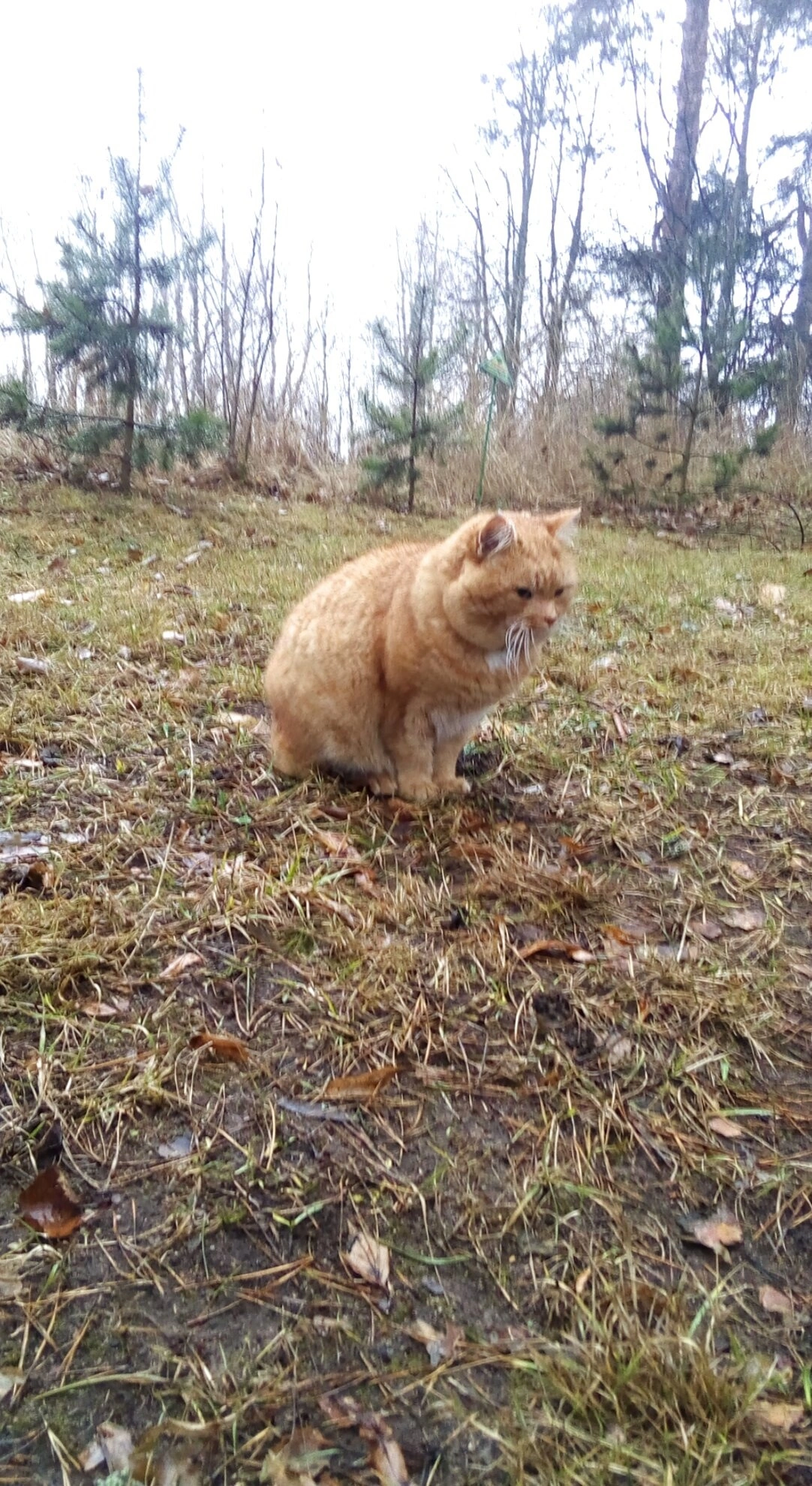 На представленной фотографии запечатлён безмятежный момент из жизни святой обители. Рыжий кот, символ домашнего уюта и спокойствия, расположился на пожухлой осенней траве, окружённый опавшими листьями и редкими травинками. Его присутствие на территории монастыря создаёт особую, одухотворённую атмосферу, напоминая о гармонии всего Божьего творения.