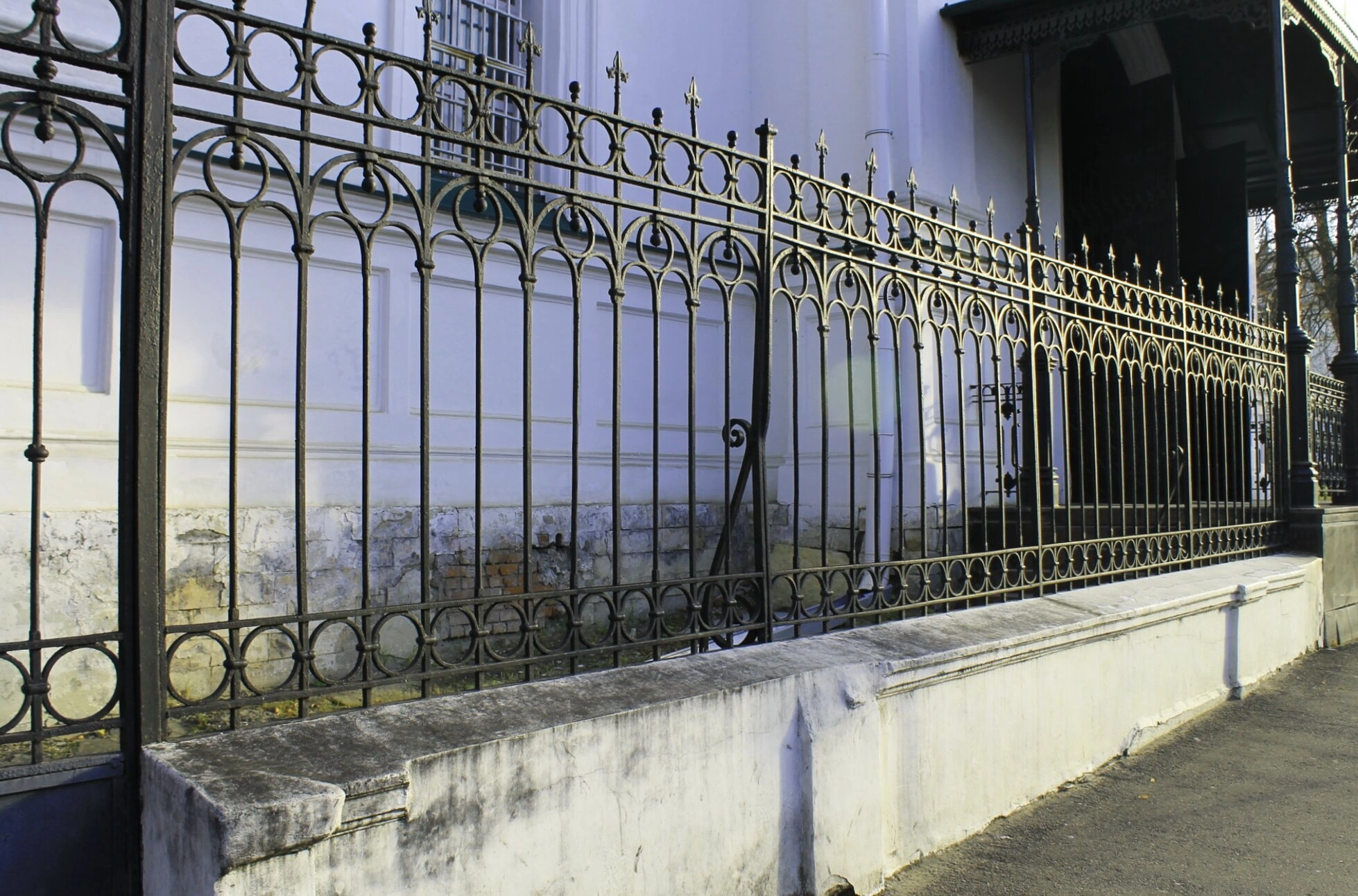 Тёмный кованый забор, изображённый на снимке, выполнен из металла с применением сложных декоративных элементов и узоров, символизирующих духовную стражу и неприкосновенность домостроительства Божия. Прочные прутья и изящные кованые детали образуют единую композицию, сочетающую в себе функциональность и высокую эстетику. Ограда установлена на низком, но основательном цоколе из природного камня, что подчёркивает её капитальность и незыблемость.