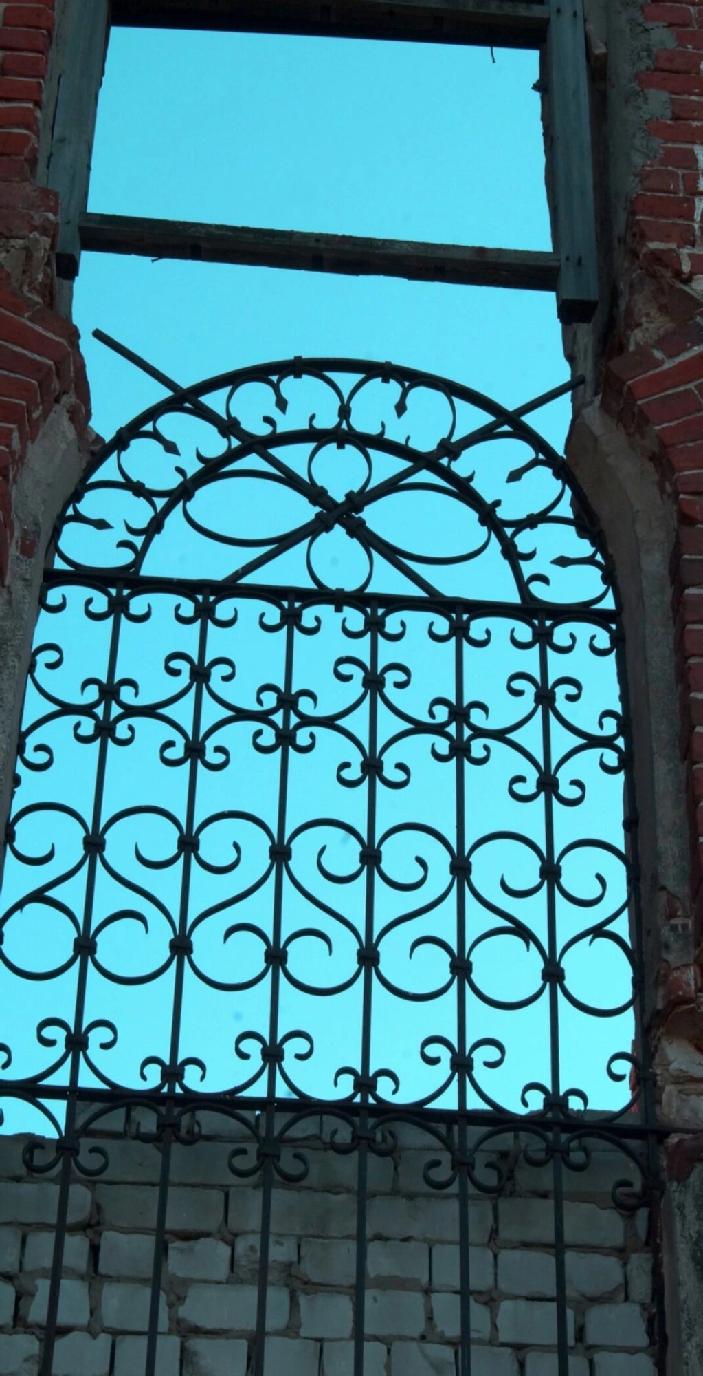 Решетка вписана в массивную кирпичную кладку стены, которая ныне пребывает в полуразрушенном состоянии. Неровные края кирпичей и осыпающийся раствор говорят о долгих годах запустения, через которые пришлось пройти святому месту. Сквозь просветы в ковке и над аркой открывается вид на чистое голубое небо, что символически напоминает о надежде и духовном возрождении.