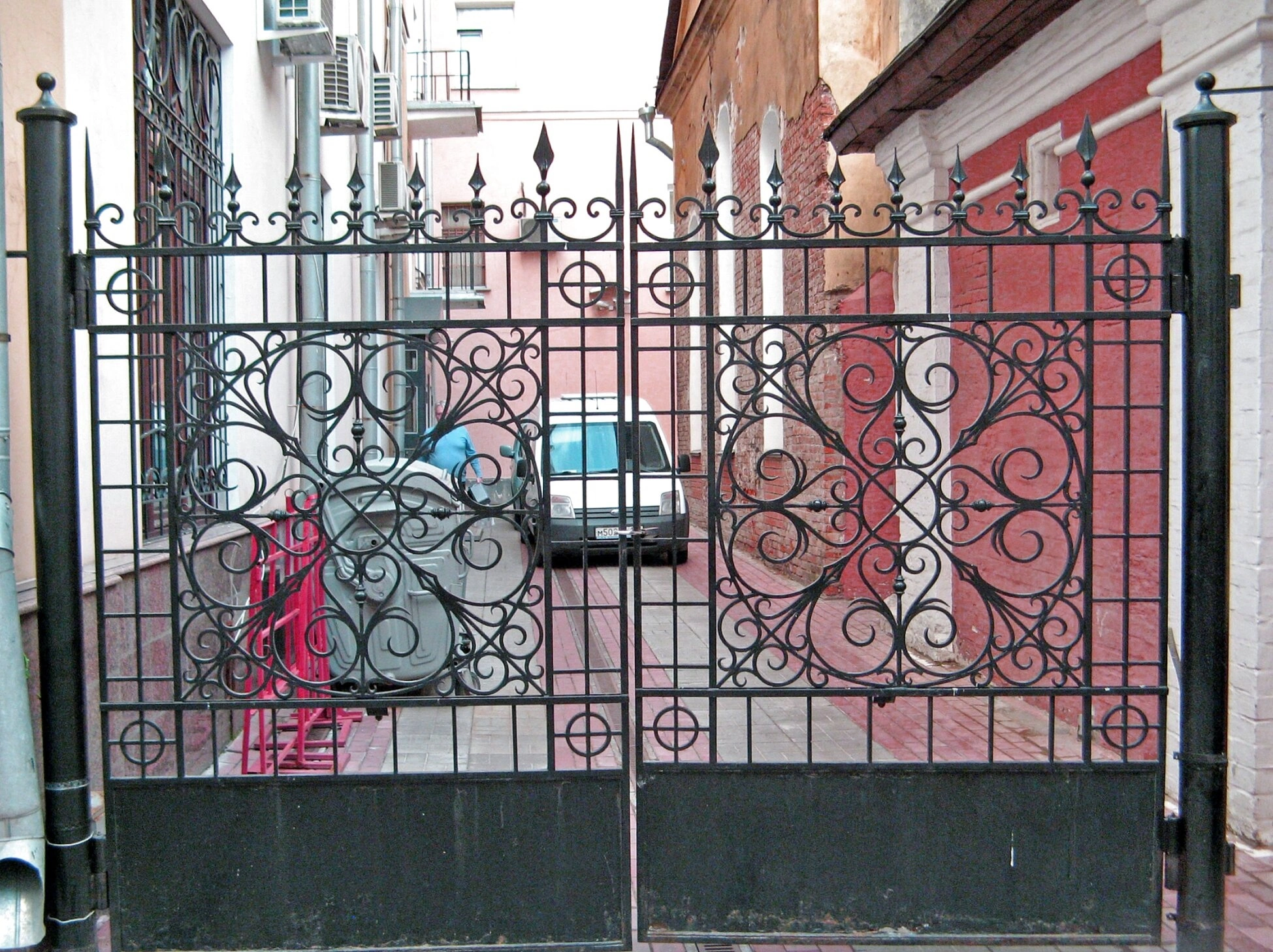 На представленной фотографии запечатлены величественные кованые въездные ворота, ведущие в проход между зданиями храмового комплекса церкви святых бессребреников Космы и Дамиана, что в Старых Панех. Эти исторические ворота, расположенные по адресу: Старосадский переулок, дом 11, строение 2, являются неотъемлемой частью архитектурного ансамбля православной святыни.