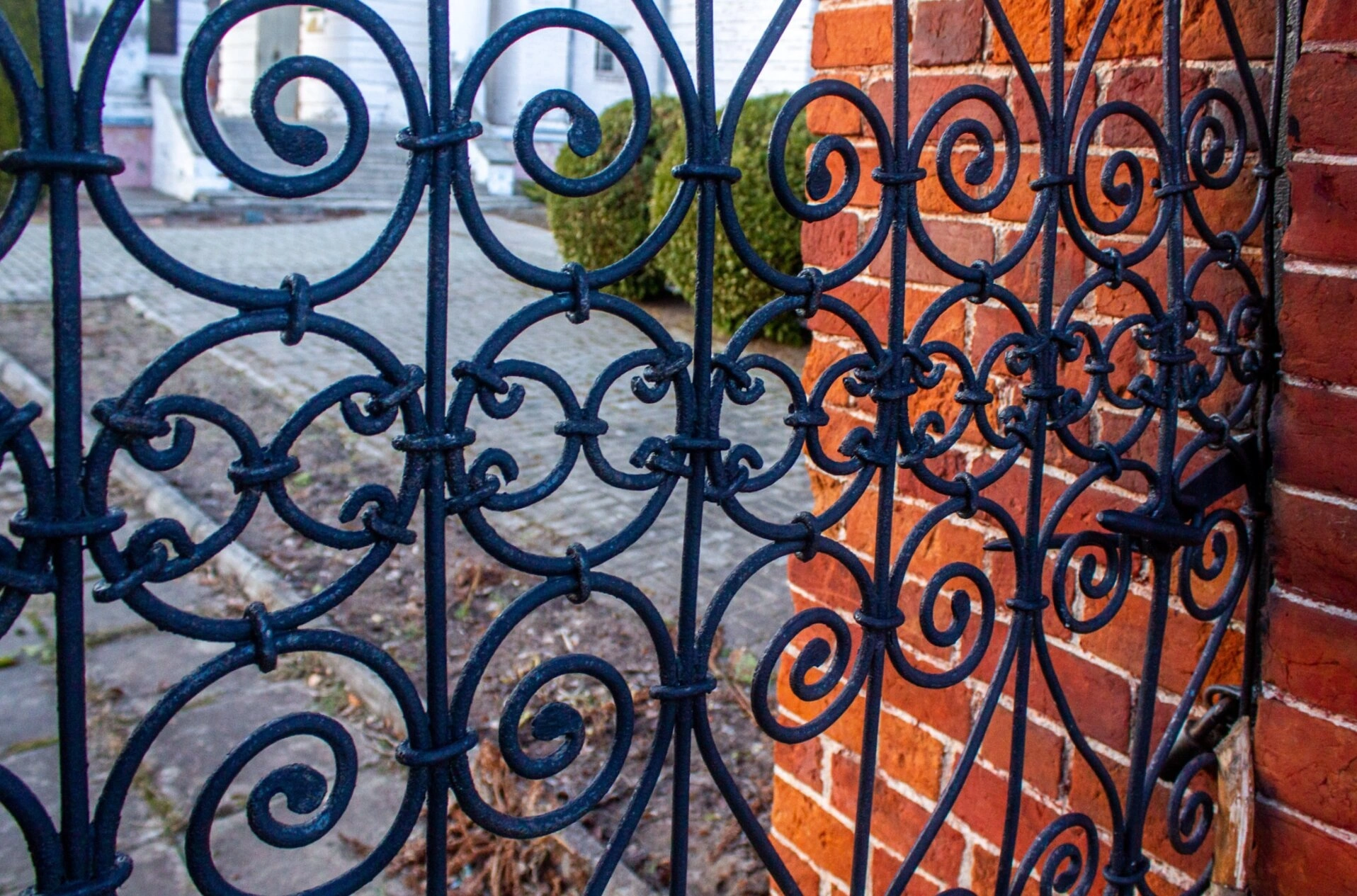 Основу композиции составляет прочная кованая решетка из темного металла, предположительно чугуна, украшенная благочестивыми декоративными элементами в виде традиционных завитков и кругов, символизирующих единство и вечность. Подобные изделия кузнечного ремесла были широко распространены в церковном зодчестве XIX века, подчеркивая величие и неприкосновенность дома Божия.