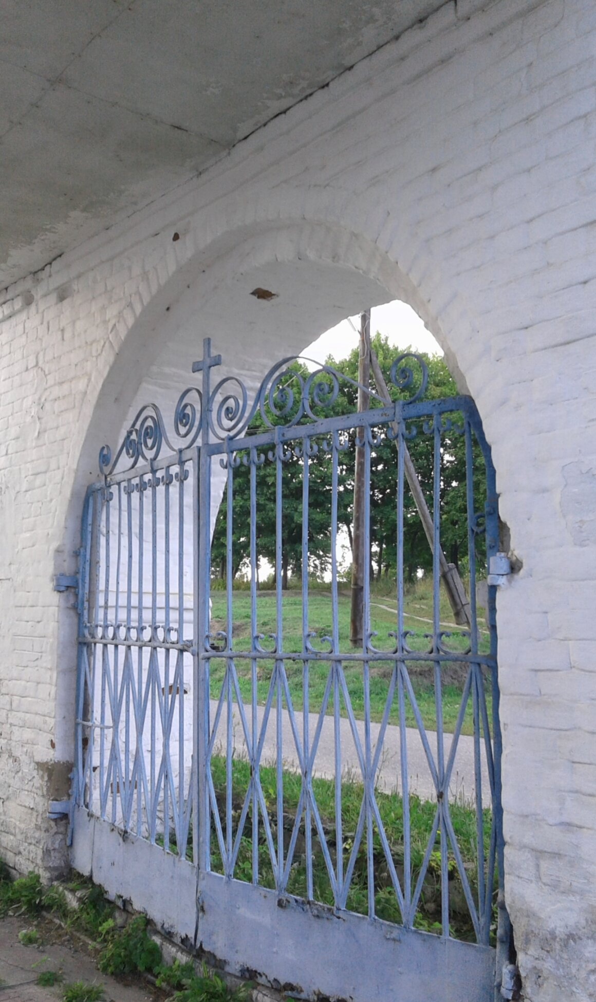 На представленной фотографии запечатлён вид через арочный проём из белого камня на искусно выполненные кованые ворота Спасо-Преображенского храма, известного также как мельничный храм, в древнем городе Шуя. Ворота, окрашенные в благостный голубовато-серый цвет, являются образцом кузнечного мастерства и украшены изящными декоративными завитками и главным символом христианской веры — крестом, венчающим конструкцию.