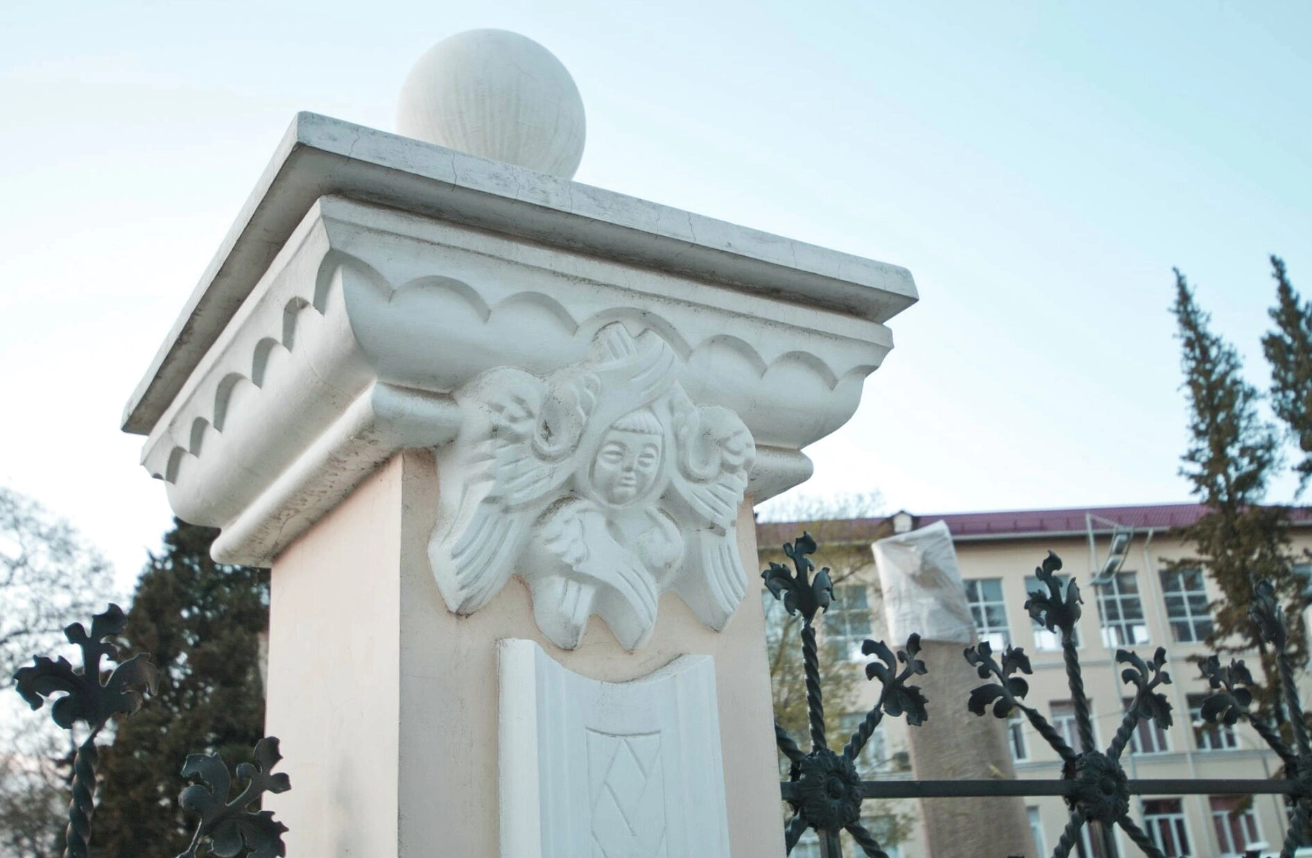 На представленной фотографии запечатлён изящный фрагмент кованой ограды, окружающей Храм Святого Равноапостольного Князя Владимира в городе Сочи. Центральным элементом композиции является барельефное изображение херувима, выполненное с высоким художественным мастерством. Лик небесного служителя воплощает традиции православной иконографии и придаёт ограде особое духовное значение.