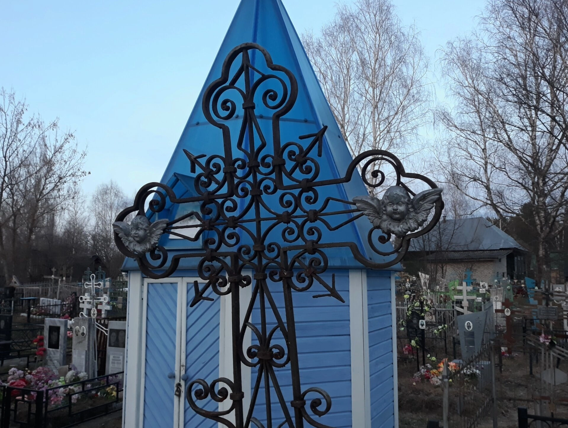 Кованый крест и часовня на кладбище Спасо-Преображенской церкви в Сухаренках