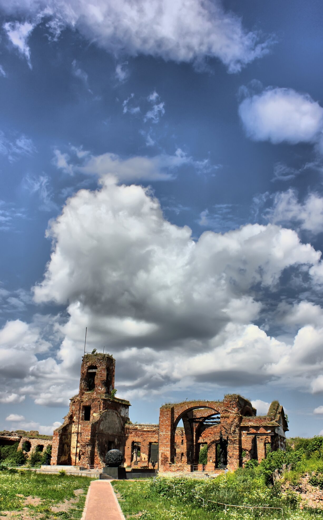 На снимке хорошо просматриваются массивные кирпичные стены и башни крепости, несущие на себе следы многовековой истории. Зелёные травяные покровы и величественное небо с облаками создают особую атмосферу благоговения перед святыней русского православия и историческим памятником.