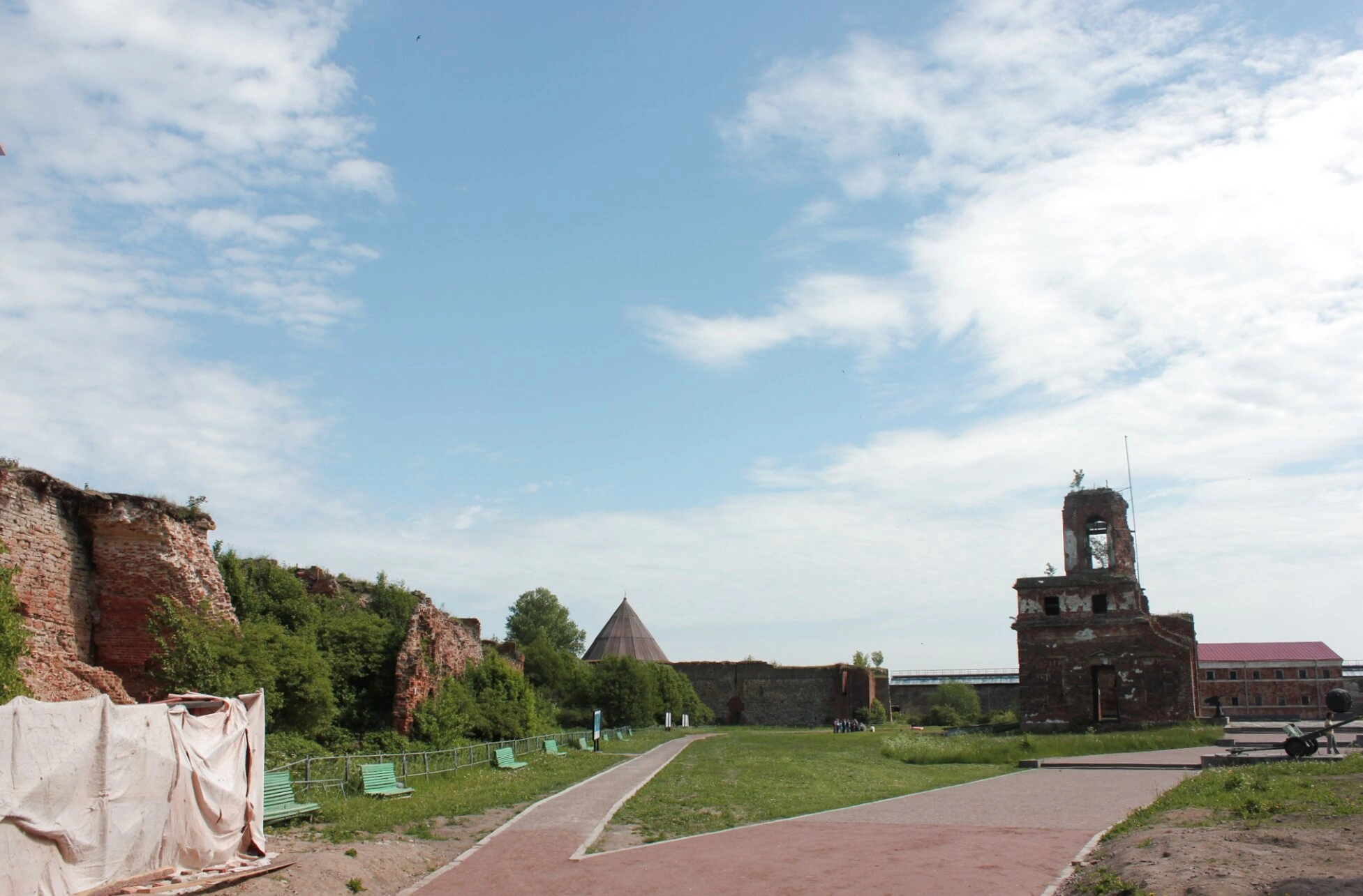 В центре внимания, справа, находятся сохранившиеся руины Церкви Рождества Святого Иоанна Предтечи. Храм сей был возведён в 1826 году при тюремном замке внутри крепости и освящён в честь великого пророка, Предтечи и Крестителя Господня Иоанна. Его стены, ныне скорбно безмолвствующие, некогда слышали молитвы узников и благоговейные песнопения. В советское время храм, как и многие святыни, был осквернён и разрушен, оставив после себя лишь фрагменты стен как напоминание о бренности земного и вечности горнего.