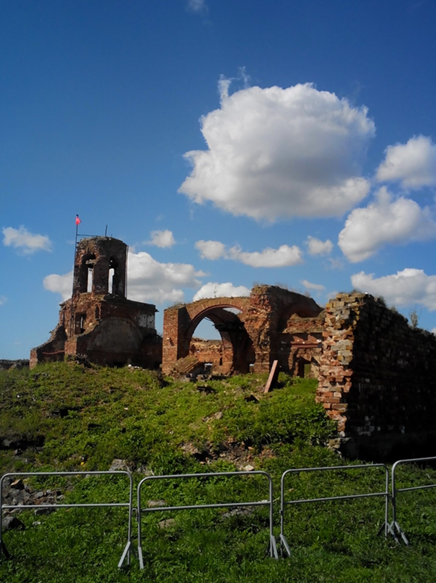 На фотографии ясно видно, как руины собора мирно покоятся под сенью голубого неба с белоснежными облаками, символизируя надежду на воскресение и вечную жизнь. Зелёная трава, покрывающая землю вокруг, напоминает о Божием милосердии и обновлении. Развевающийся на сохранившейся крепостной башне флаг подчёркивает непрерывность исторического пути Отечества нашего и торжество православной веры.
