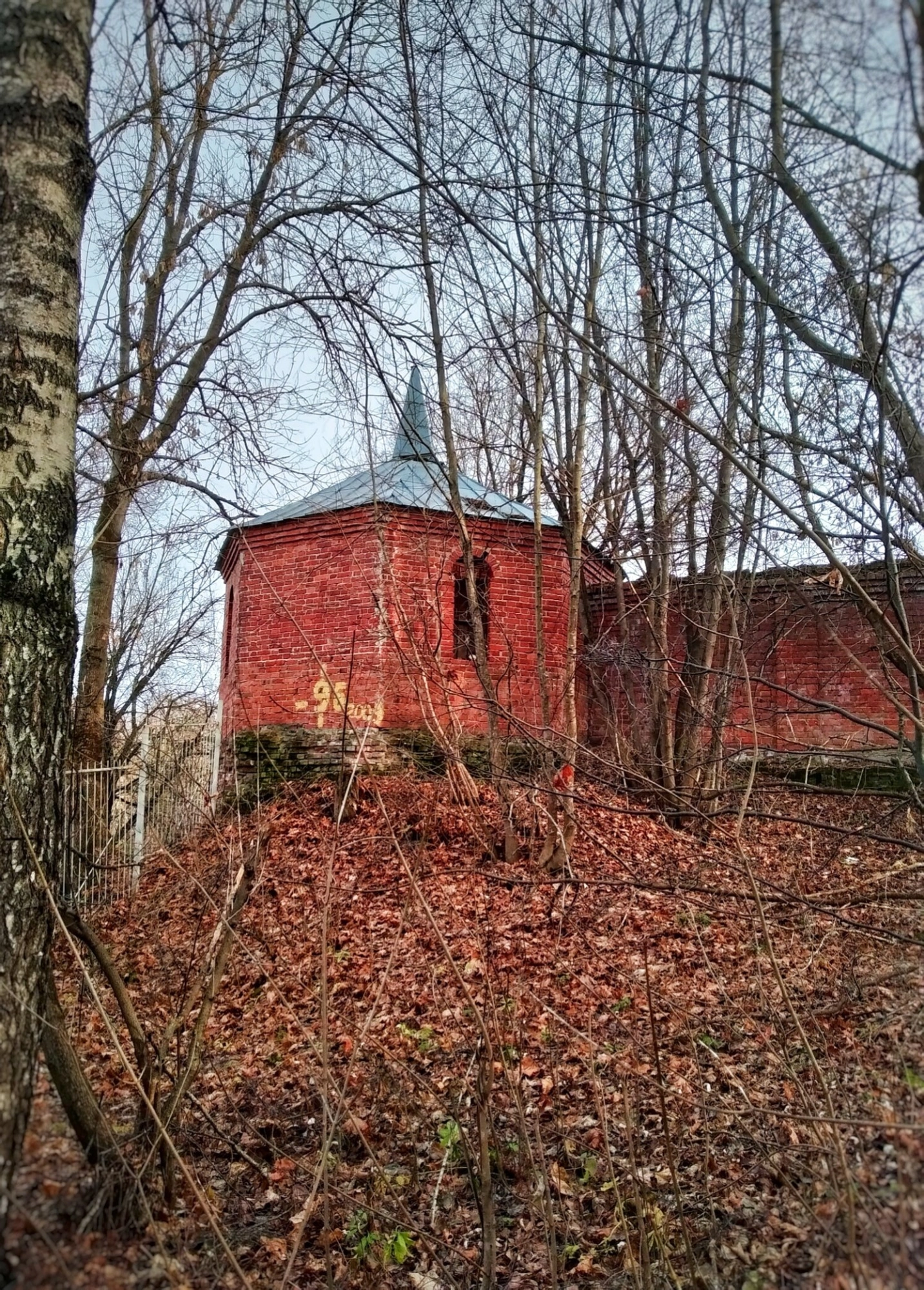 На фотографии запечатлена одна из башен древней крепостной стены Свято-Лаврентьева мужского монастыря, что располагается в городе Калуге. Кирпичная постройка с мощными стенами и стройным шатром-куполом, увенчанным православным крестом, возвышается на пригорке, свидетельствуя о былой силе и духовном предназначении святой обители.