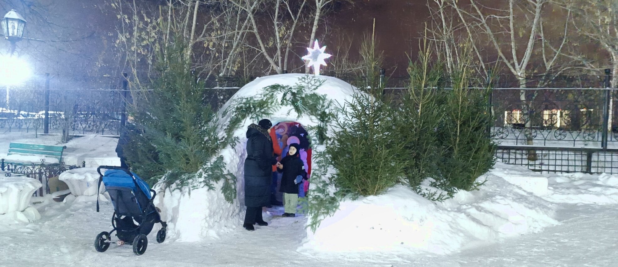 В центре композиции возвышается символическая купель, стилизованная под снежное иглу, что отсылает к традиции освящения вод и крещенских купаний. Купол сооружения увенчан ярко сияющей звездой, напоминающей о Вифлеемской звезде и рождественских истоках праздника, а вход украшен свежими зелёными ветвями как символом вечной жизни во Христе. Рядом с купелью замерли фигуры двух верующих — взрослого и ребёнка, что подчёркивает семейный и всеобъемлющий характер празднования, объединяющего всю паству.