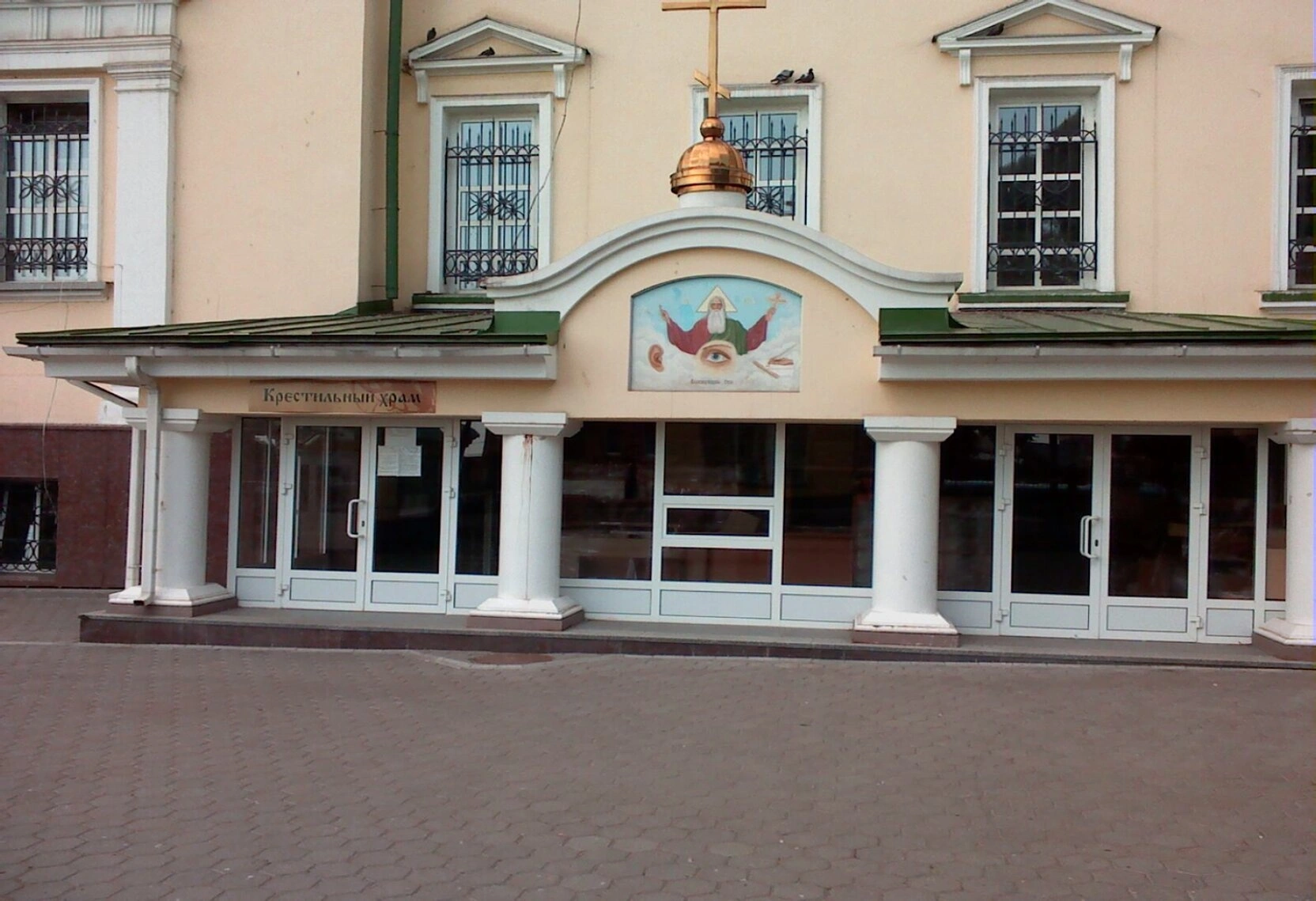 Центральный вход акцентирован арочным проёмом и фронтоном, над которым размещена фреска или икона с библейским сюжетом. Окна фасада украшены коваными решётками, обеспечивающими безопасность и добавляющими элемент декора. Чётко читаемая надпись «Крестильный храм» над входом не оставляет сомнений в предназначении этого богослужебного помещения.