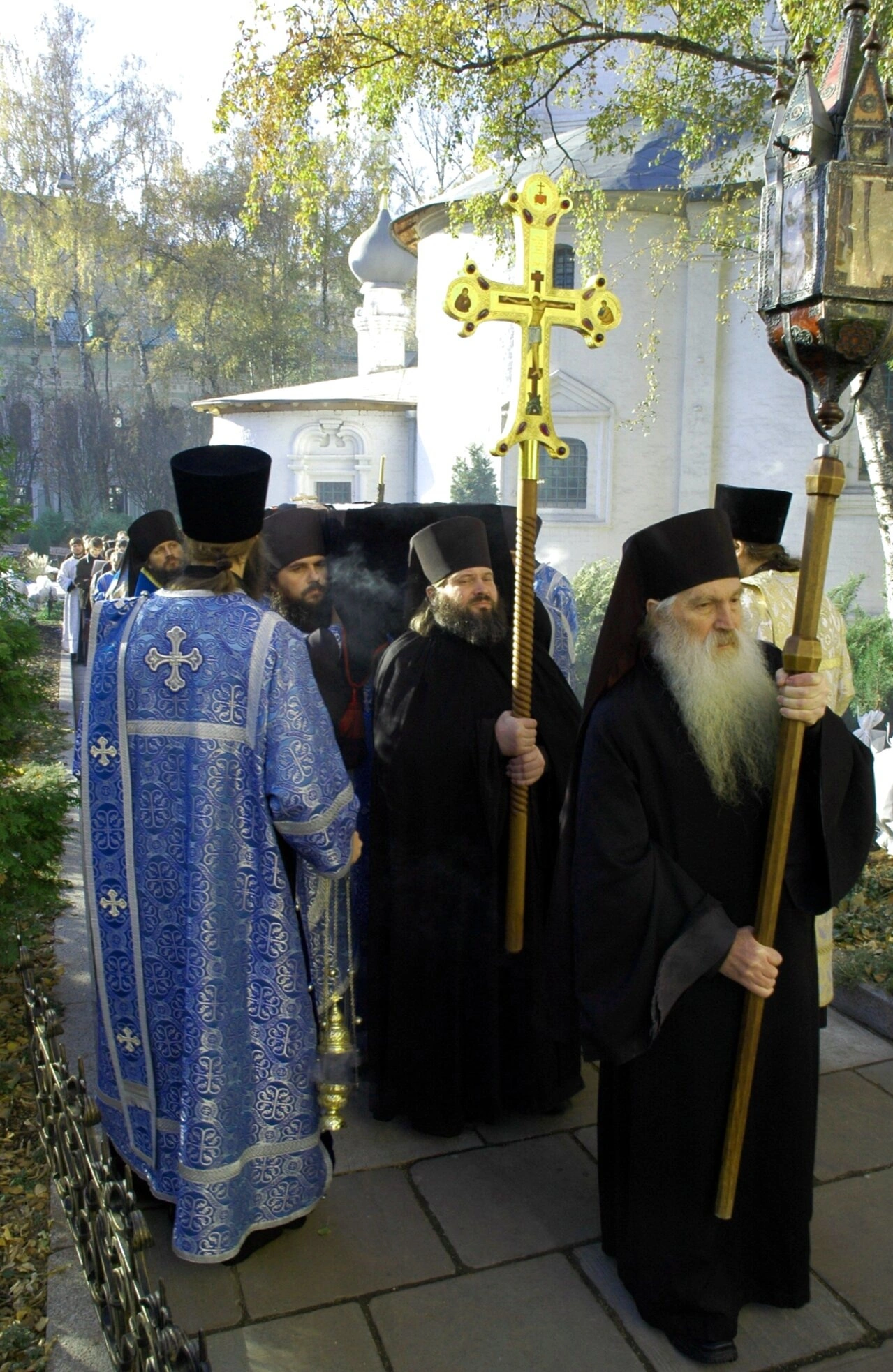 Величественная процессия движется по монастырскому двору к святым вратам или храму. Во главе шествия клирики несут запрестольный крест и церковный фонарь, что символизирует собой свет Христова учения и следование за Христом, который есть «Путь, Истина и Жизнь». Участники хода — священнослужители и монашествующие в традиционных чёрных и синих рясах — совершают молитвенное шествие с благоговением и духовной сосредоточенностью.