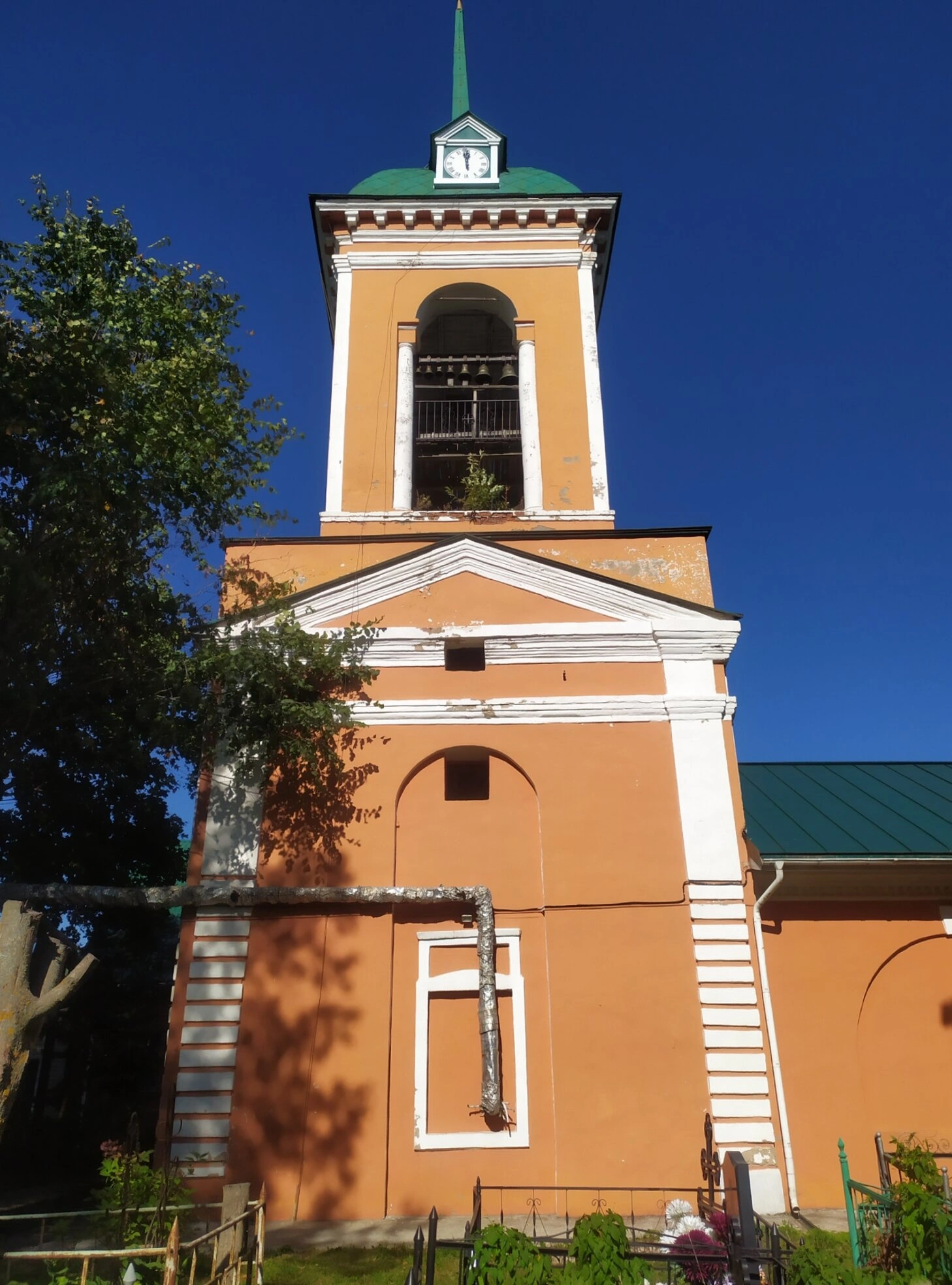 На переднем плане фотографии видны деревья и кустарники, обрамляющие храм, а также фрагмент металлического ограждения. За церковным зданием просматривается территория кладбища, что соответствует исторической планировке храмовых комплексов, где церковь часто становилась духовным центром для жителей окрестных селений как при жизни, так и по их кончине.
