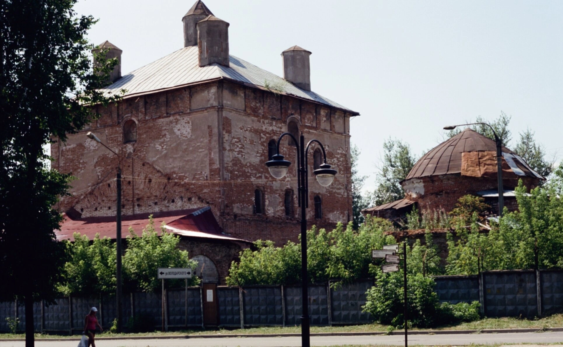 История этой святыни трагична: в годы богоборческих гонений храм был закрыт, его величественная колокольня варварски снесена, а прекрасное пятиглавие и паперти уничтожены. Несмотря на эти утраты, монументальный объём церкви и по сей день впечатляет своей мощью и строгой красотой. На снимке здание частично скрыто кронами деревьев, что придаёт кадру особую живописность и ощущение уединённости.