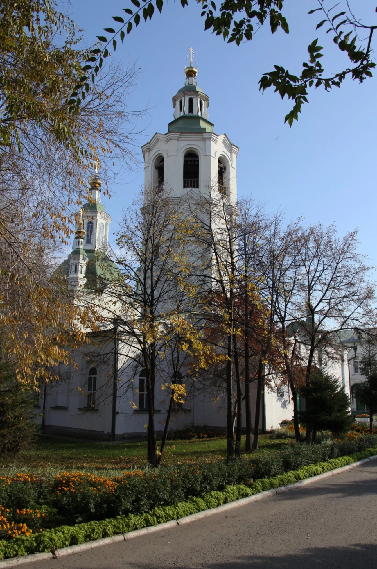 На представленной фотографии запечатлён величественный православный храм — Крестовоздвиженская церковь, являющаяся частью архитектурного ансамбля Свято-Троицкого мужского монастыря в городе Тюмени. Храм, освящённый в честь Воздвижения Честного и Животворящего Креста Господня, предстаёт во всей своей красе в погожий осенний день.