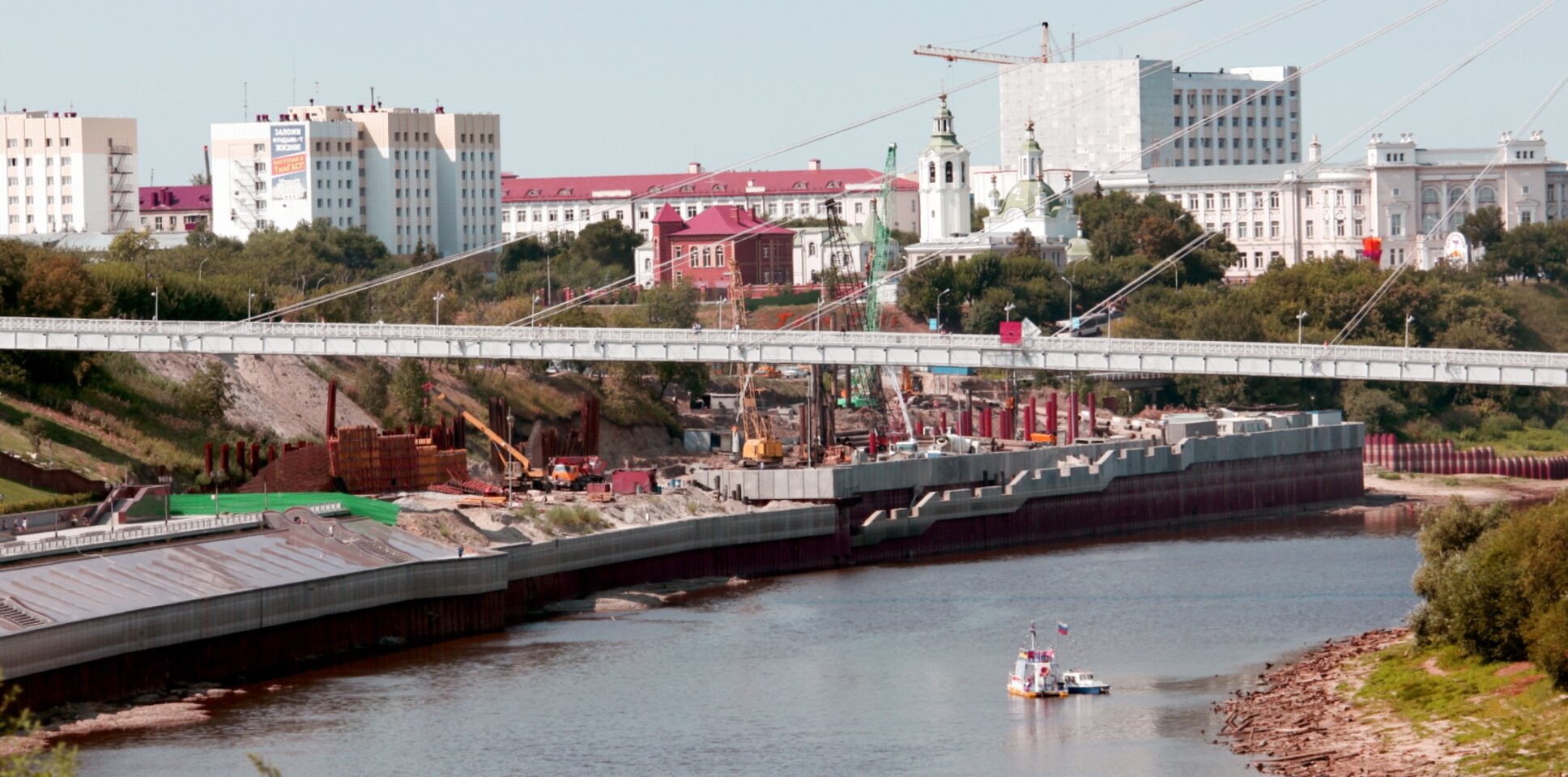 На переднем плане фотографии виден пешеходный Мост Влюбленных, перекинутый через спокойные воды Туры. Река, являющаяся одной из главных водных артерий Западной Сибири, обрамляет храм с южной стороны. На противоположном берегу просматривается современная городская застройка, что подчёркивает гармоничное соседство исторического наследия и современной инфраструктуры.