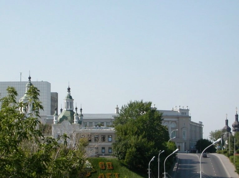 На представленной фотографии запечатлён прекрасный вид на один из духовных центров Тюмени — пятиглавый Крестовоздвиженский храм, относящийся к Русской Православной Церкви. Снимок был сделан с особого ракурса, который позволяет видеть не только величественное церковное здание, но и праздничную надпись «60 ЛЕТ», выполненную на травяном склоне в честь юбилея образования Тюменской области.