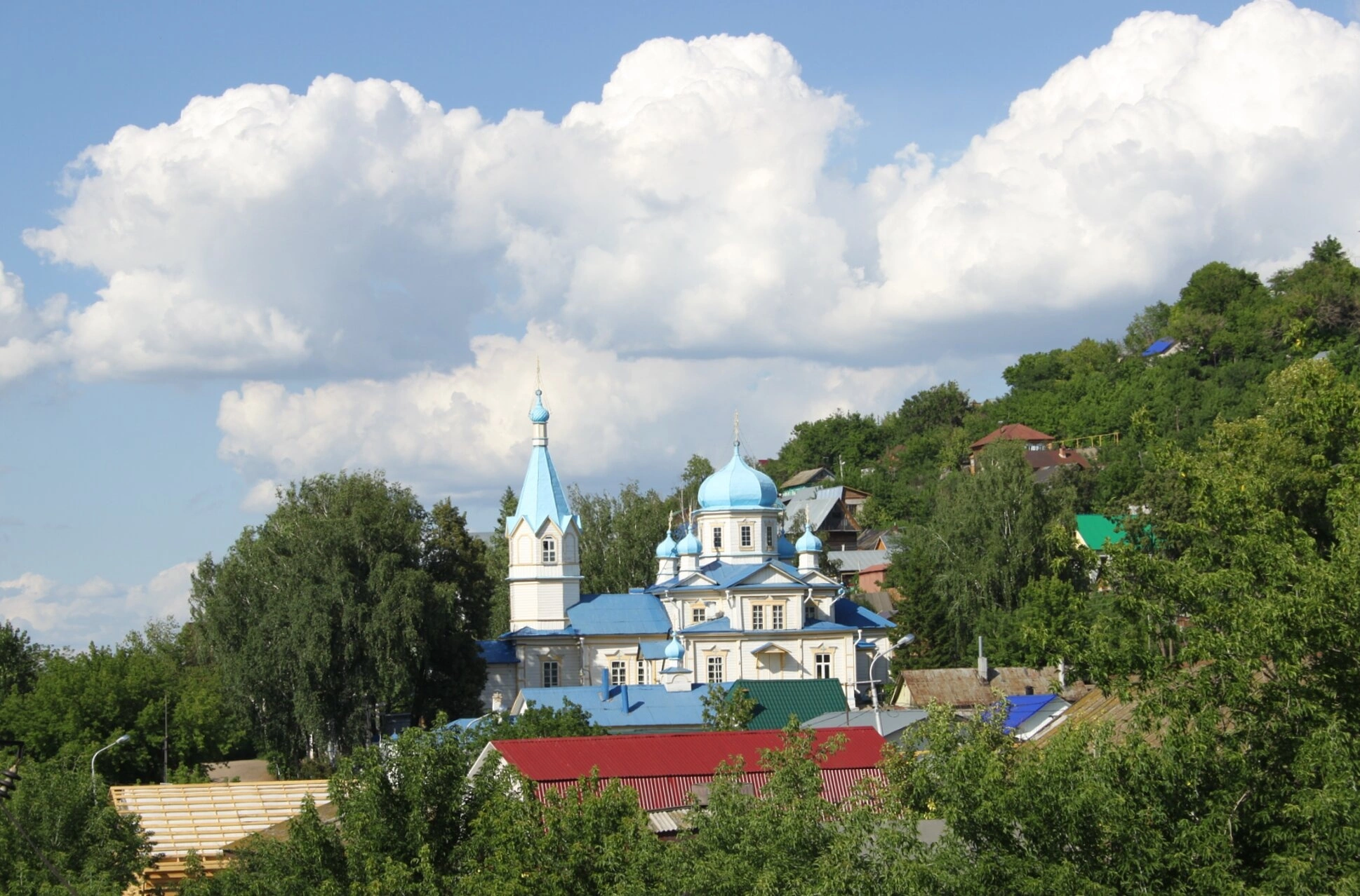 На представленной фотографии запечатлена Крестовоздвиженская церковь, один из старейших и наиболее почитаемых православных храмов города Уфы. Храм располагается в живописном месте на возвышенности по адресу: улица Воздвиженская, что в исторической части города, и является значимым памятником церковной архитектуры второй половины XIX века.
