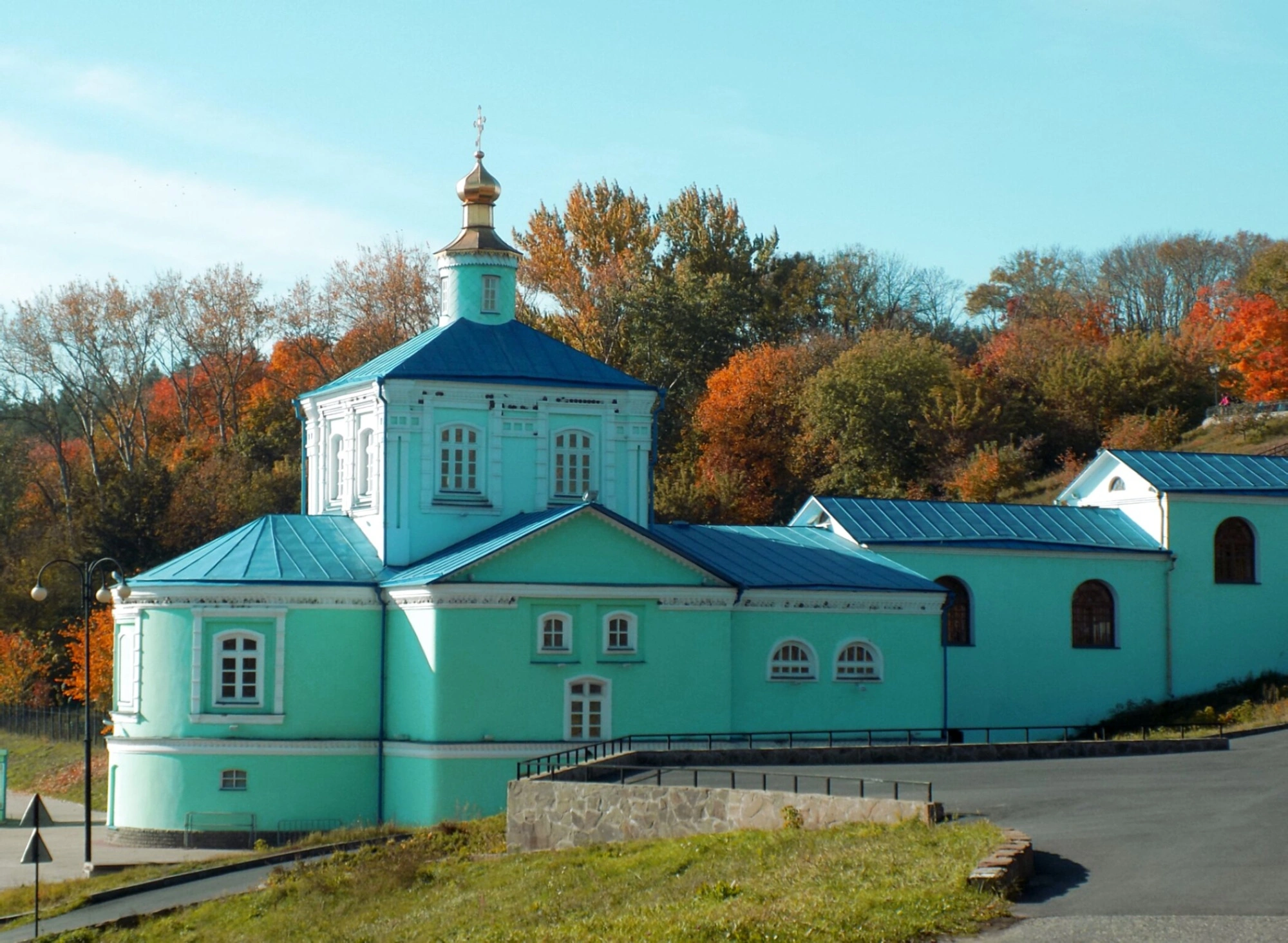 Храм, изображённый на снимке, поражает своим благолепием и ярким, небесно-голубым цветом стен, который символизирует чистоту и покровительство Пресвятой Богородицы. Сияние золотого купола, увенчанного животворящим крестом, видно издалека и притягивает взоры паломников. Осенняя листва, окружающая собор, добавляет пейзажу умиротворённости и духовной теплоты, напоминая о бренности земной жизни и вечности горнего мира.