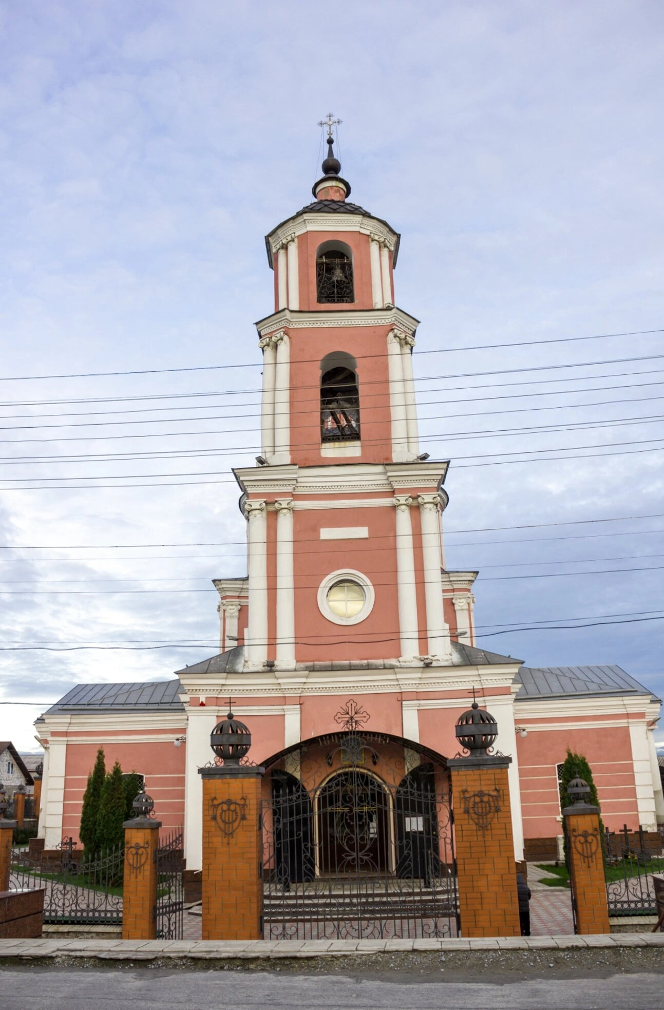 Здание храма исполнено в благолепии розовых и белых тонах, что создаёт ощущение особой торжественности и духовной радости. Архитектурный облик характеризуется строгими классическими формами, украшенными колоннами и изящными карнизами. Высокая многоярусная колокольня, увенчанная золочёным куполом с воздвигнутым крестом, гордо возносится к небу, призывая православных на молитву своими колоколами, которые размещены в арочных проёмах.