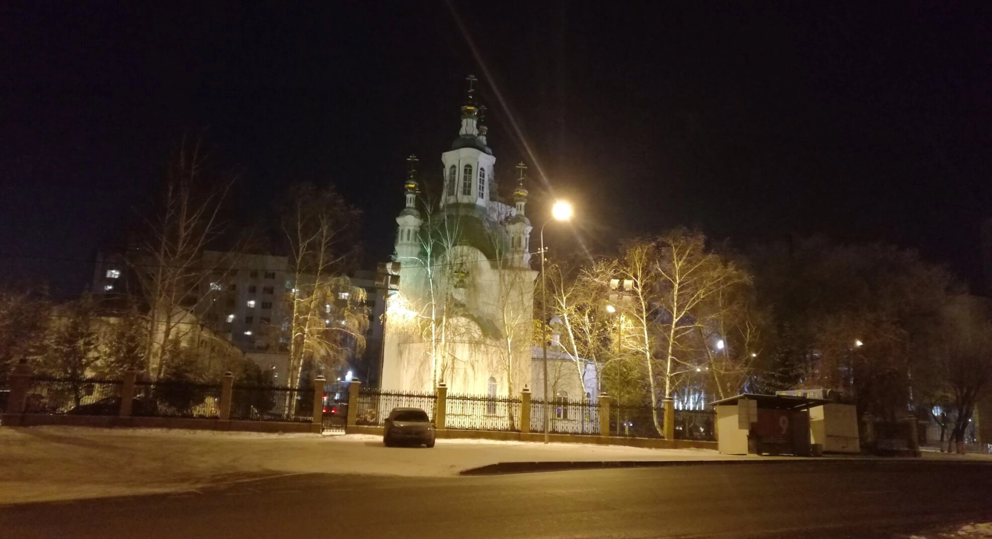 - Крестовоздвиженский храм в Тюмени зимней ночью