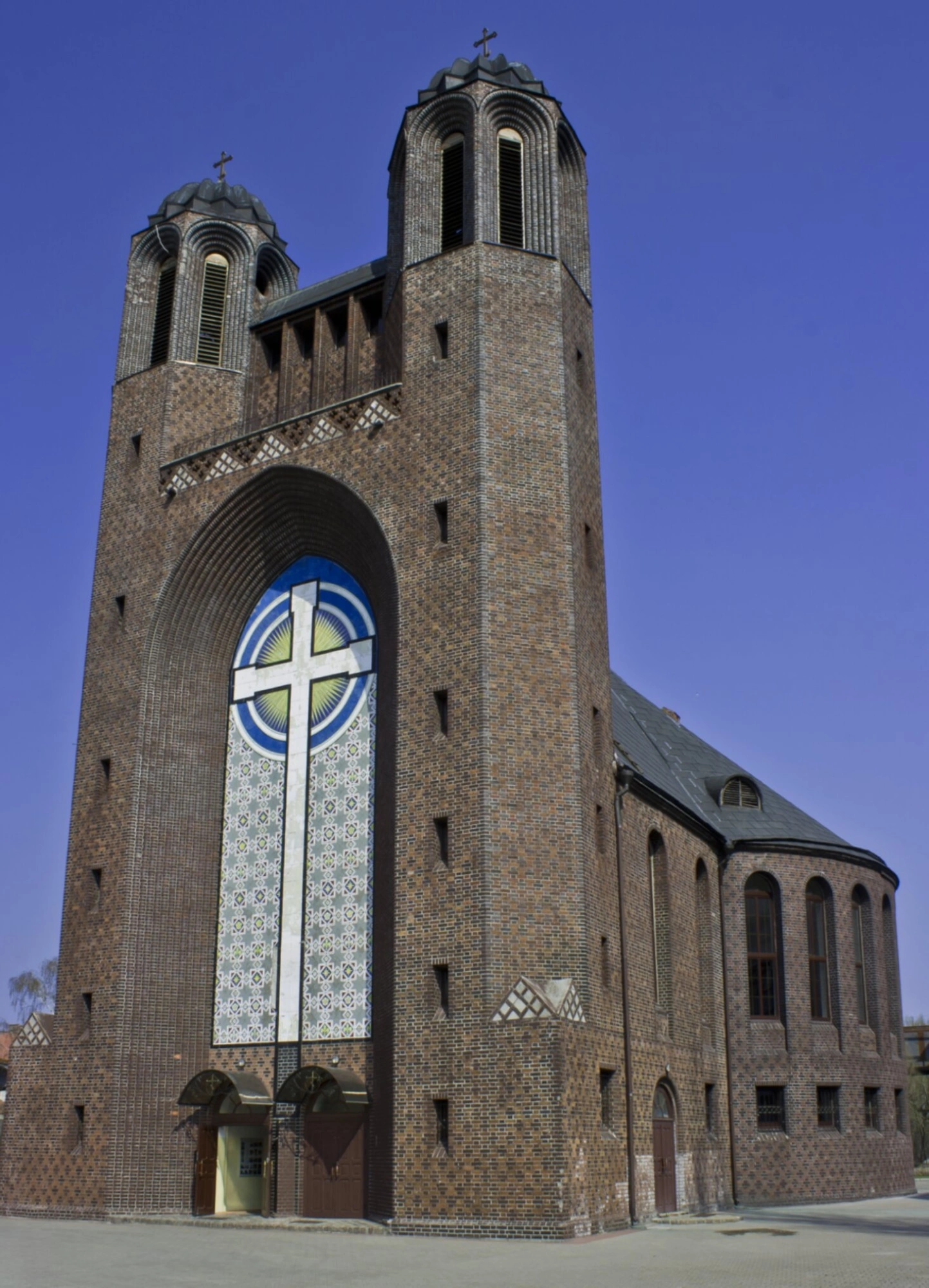 Здание собора является выдающимся памятником культовой архитектуры первой трети XX века, построенным в стиле неоготики с элементами модерна. Оно возведено из характерного для региона коричнево-красного клинкерного кирпича. Над западным фасадом горделиво возносятся к небу две стройные, равновысокие башни, увенчанные куполами-шатрами и соединённые между собой крытой арочной галереей. Центральным элементом фасада служит монументальная ниша-портал, украшенная уникальным панно из майолики с изображением большого креста, что символизирует предназначение храма.