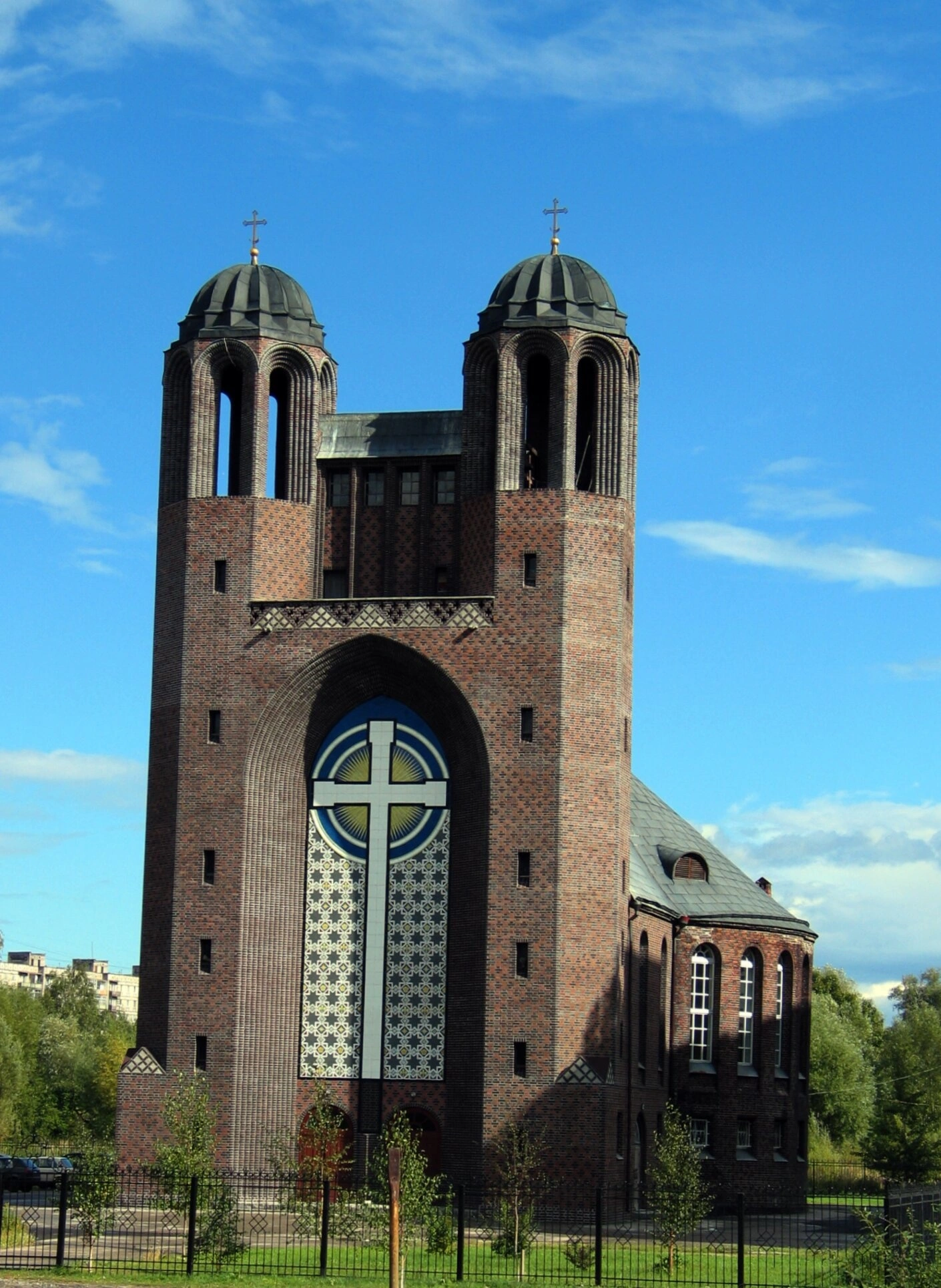 Архитектурный облик собора, выполненного из красного клинкерного кирпича, представляет собой величественный памятник неоготики с элементами романского стиля. Западный фасад здания доминирует огромная ниша-портал, украшенная уникальным панно из кадинской майолики с изображением большого креста. Изначально на пересечении перекладин креста располагалась надпись на немецком языке, которая впоследствии была утрачена.