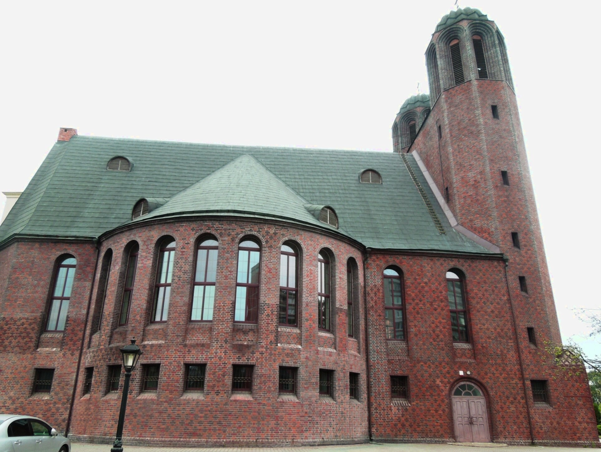 Крыша здания покрыта тёмной черепицей, на её скатах можно различить округлые слуховые окна. Фасад украшен сдержанным, но изящным декором из того же кирпича, подчёркивающим монументальность постройки. У основания одной из башен виден арочный портал, ведущий в святая святых храма.