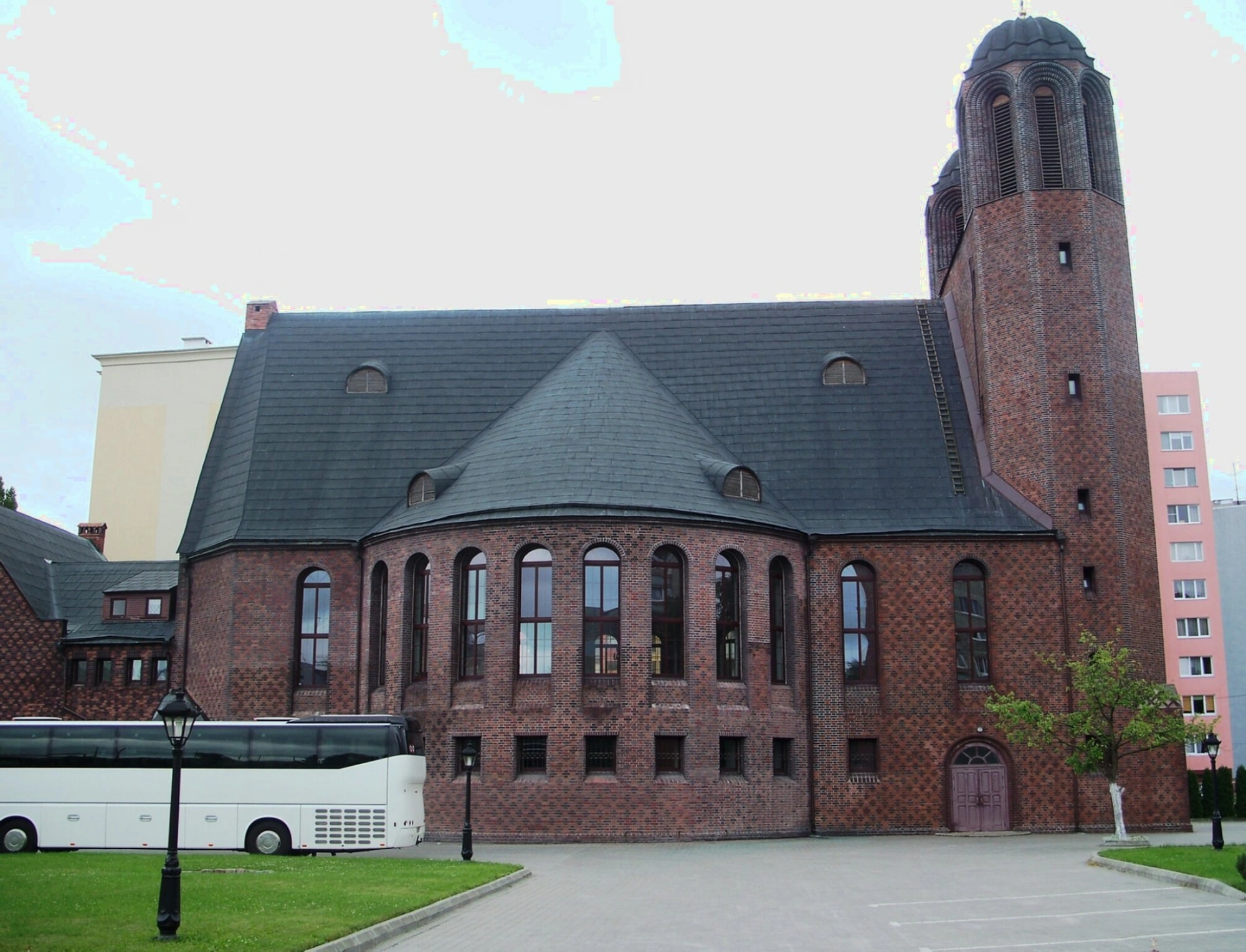 Здание собора представляет собой яркий образец кирпичной готики, характерной для средневековой немецкой архитектуры Восточной Пруссии. Монументальное сооружение отличается строгими формами, характерной кладкой из красного кирпича и мощной круглой башней-колокольней, увенчанной высоким шпилем. Историческое здание было возведено в 1930-1933 годах по проекту архитектора Артура Киктона и первоначально являлось лютеранской кирхой.