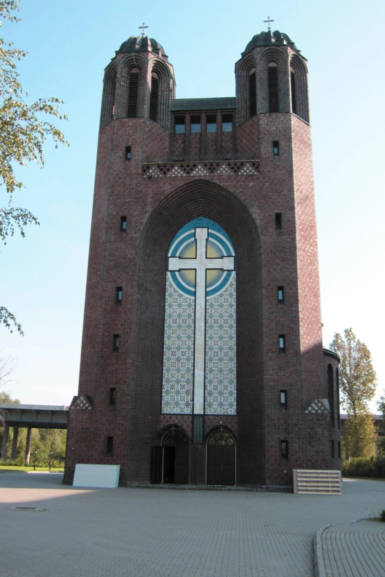 Центральным элементом композиции служит огромная ниша-портал, в которой размещено уникальное панно из кадинской майолики. На этом керамическом панно изображён большой крест, на пересечении перекладин которого ранее находилась надпись на немецком языке: «Слово о кресте являет могущество Господа». Этот крест не только дал историческое название храму, но и является его духовным и композиционным центром, символизируя искупительную жертву Спасителя.