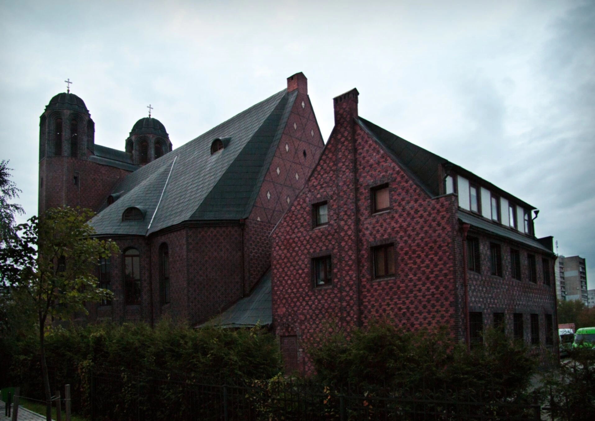 На снимке можно видеть величественный облик собора. Слева возвышается основное здание храма с его строгими формами и двумя башнями, увенчанными православными крестами, сменившими прежние шпили. Центральную часть кадра занимает пристройка комплекса, также выдержанная в едином архитектурном стиле. Её черепичная кровля и асимметрично расположенные окна разных форм придают ансамблю объём и глубину.