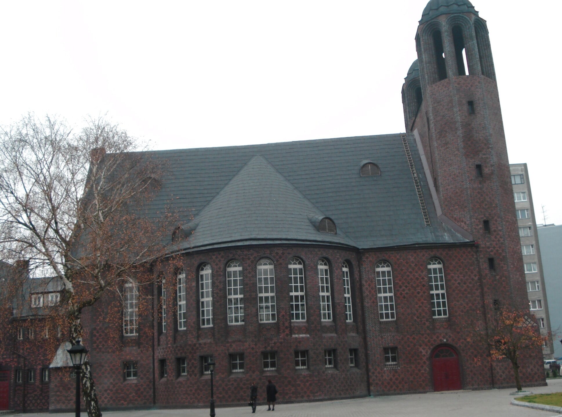 На фотографии запечатлён Крестовоздвиженский собор города Калининграда, являющийся выдающимся памятником архитектуры и истории. Это здание, известное также под своим прежним названием — кирха Кройцкирха, служит ярким примером неоготического стиля из красного кирпича, характерного для Восточной Пруссии. Собор располагается в самом центре города, на острове Кнайпхоф, по соседству с Кафедральным собором.