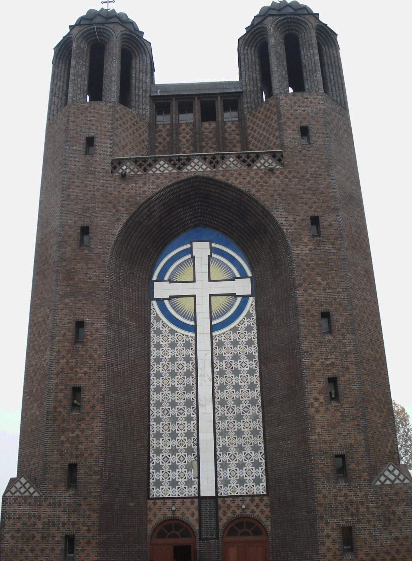 Архитектурный облик собора, выполненный в стиле модернизированной готики, отличается монументальностью и строгостью форм. Фасад здания сложен из характерной клинкерной кирпичной кладки, а его симметричную композицию завершают две высокие квадратные башни-звонницы, увенчанные изящными куполами-шатрами. Центральный фасад украшает крупное круговое окно-роза с выразительным изображением православного креста, обрамлённого декоративным орнаментом, что является смысловым и композиционным центром всей постройки.
