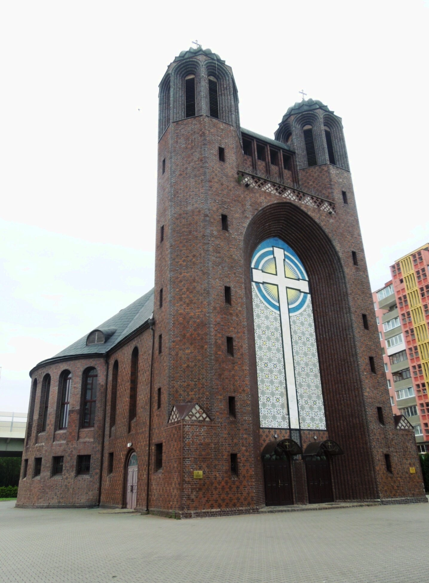 На представленной фотографии запечатлён Крестовоздвиженский собор города Калининграда — православный храм, имеющий богатую историю и являющийся объектом культурного наследия. Здание, расположенное по адресу: улица Генерала Павлова, 2, было возведено в 1930 году по проекту архитектора Артура Киктона для старокатолической общины Кёнигсберга и изначально носило название Кирха Святого Креста (Кройцкирха).