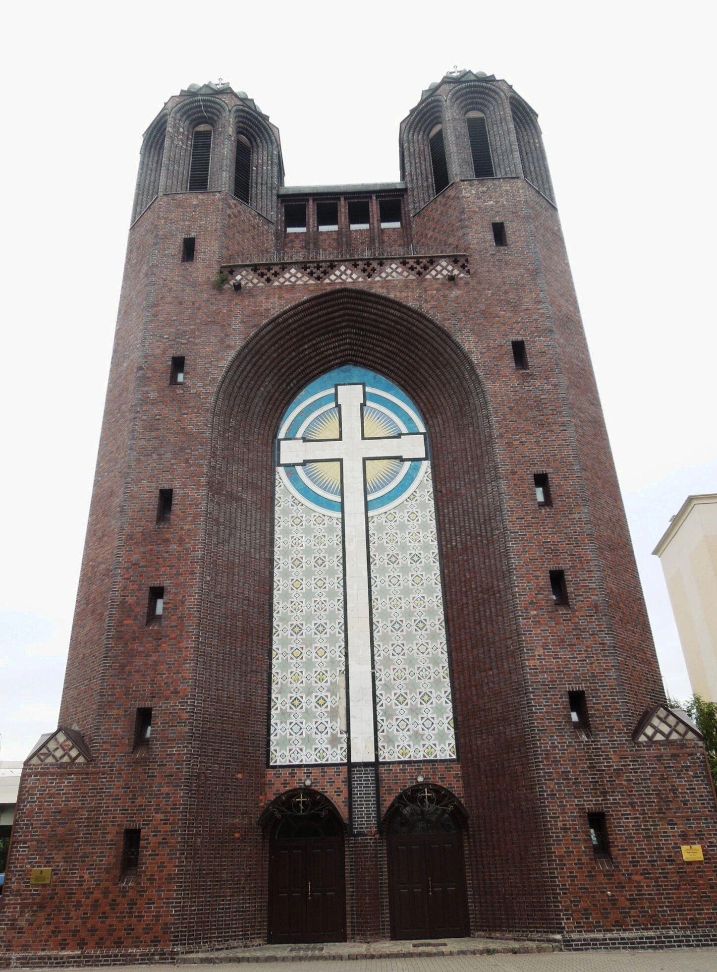 Под витражным окном расположены два арочных портала, ведущих в притворы собора. Лаконичность и монументальность форм свидетельствуют о влиянии идей функционализма.