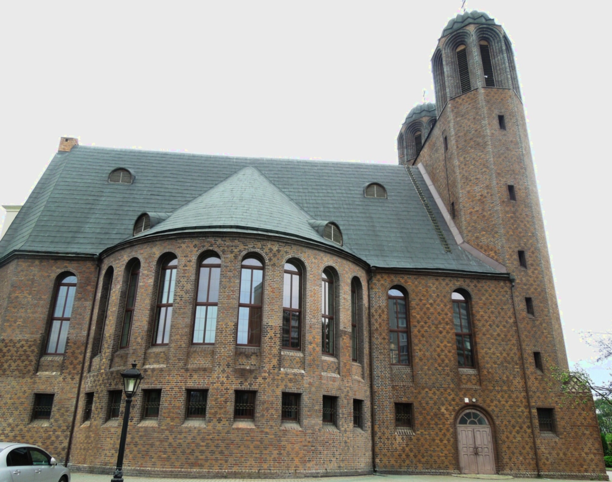 Архитектура храма представляет собой яркий пример кирпичного строительства первой половины XX века. На снимке хорошо просматривается монументальный кирпичный фасад, характерный для северогерманской традиции. Главный акцент композиции составляют две высокие стройные башни-колокольни, увенчанные куполами, которые устремляются в небо, символизируя молитвенное горение. Фасад украшают многочисленные высокие арочные окна, наполняющие внутреннее пространство храма божественным светом. Арочный портал и двустворчатые деревянные двери обозначают вход в дом Божий.