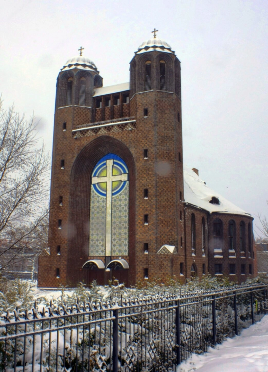 Архитектурный облик собора, выполненного из красного клинкерного кирпича, представляет собой яркий пример немецкого строительного искусства начала XX века. Фасад храма украшает грандиозное витражное окно в форме креста, являющееся его главной отличительной чертой и хорошо видное на снимке. Две стройные башни, устремлённые в небо, завершаются православными крестами, символизируя преемственность и духовное преображение.