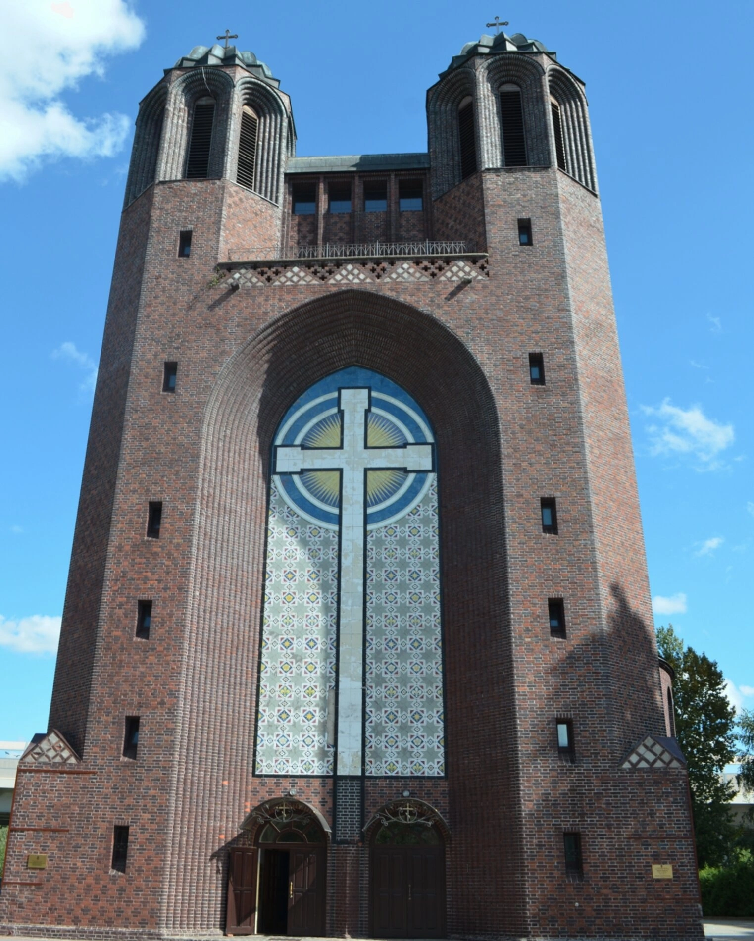 На снимке прекрасно виден монументальный кирпичный фасад здания, выполненный в стиле, характерном для северогерманской архитектуры. Фасад украшают две стройные башни, устремлённые в небо и символизирующие молитвенное горение верующих. Центральным элементом композиции является огромное арочное окно-роза, в котором размещён великолепный витраж. На витраже искусно изображён христианский крест, лучи света, проходящие через него, наполняют пространство храма благодатным сиянием.
