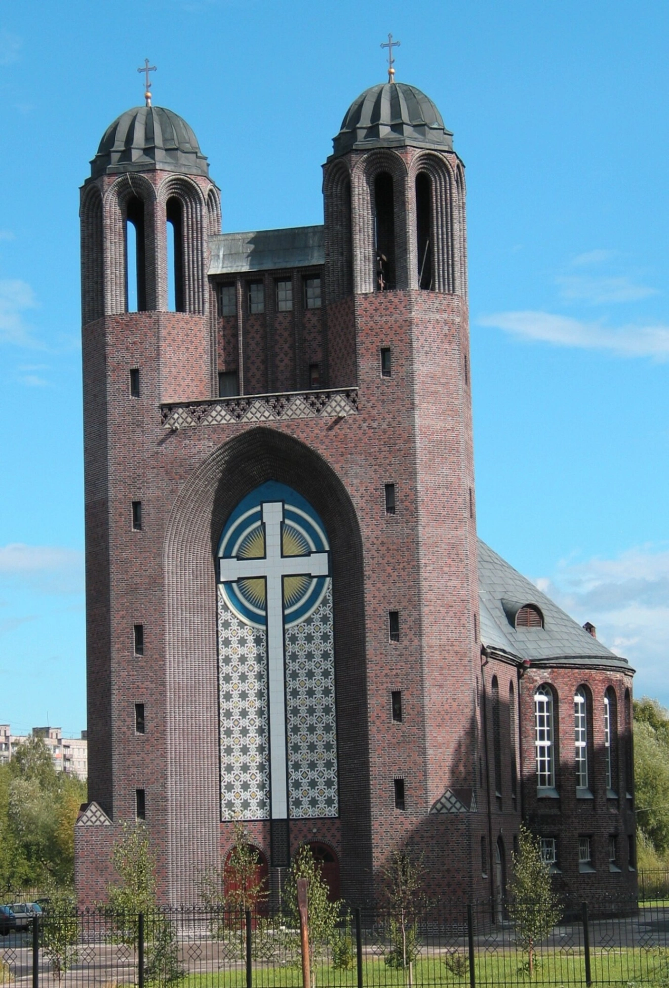 Изначально сооружение было построено как лютеранская кирха Святого Креста (Кройцкирха) и освящено в 1933 году, став последним культовым зданием, возведённым в Кёнигсберге перед Второй мировой войной. Архитектурный облик храма выполнен в стиле модернизированной готики и отличается строгостью форм. Фасад здания, сложенный из клинкерного кирпича, украшен монументальным оконным проёмом в форме креста, что является его главной отличительной чертой. Две симметричные башни, увенчанные куполами, завершают композицию, придавая ей устремлённость ввысь.
