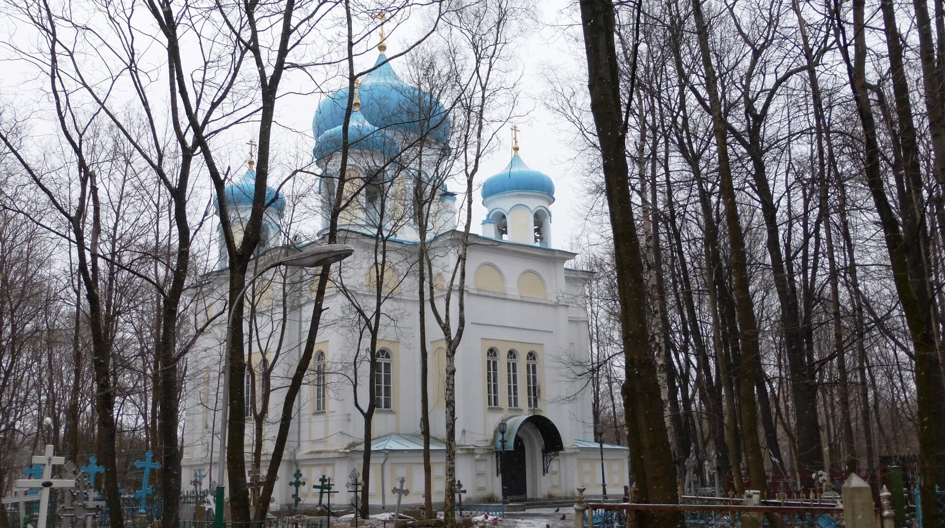 На представленной фотографии запечатлён Крестовоздвиженский собор, находящийся в городе Петрозаводске на территории Зарецкого кладбища. Этот старинный храм, освящённый в честь Воздвижения Честного и Животворящего Креста Господня, является одной из главных духовных и архитектурных доминант исторической части города. Собор уникален тем, что это единственный храм Петрозаводска, который не был закрыт, осквернён или разрушен в годы лихолетья и богоборчества, продолжая непрестанно действовать даже в советский период.