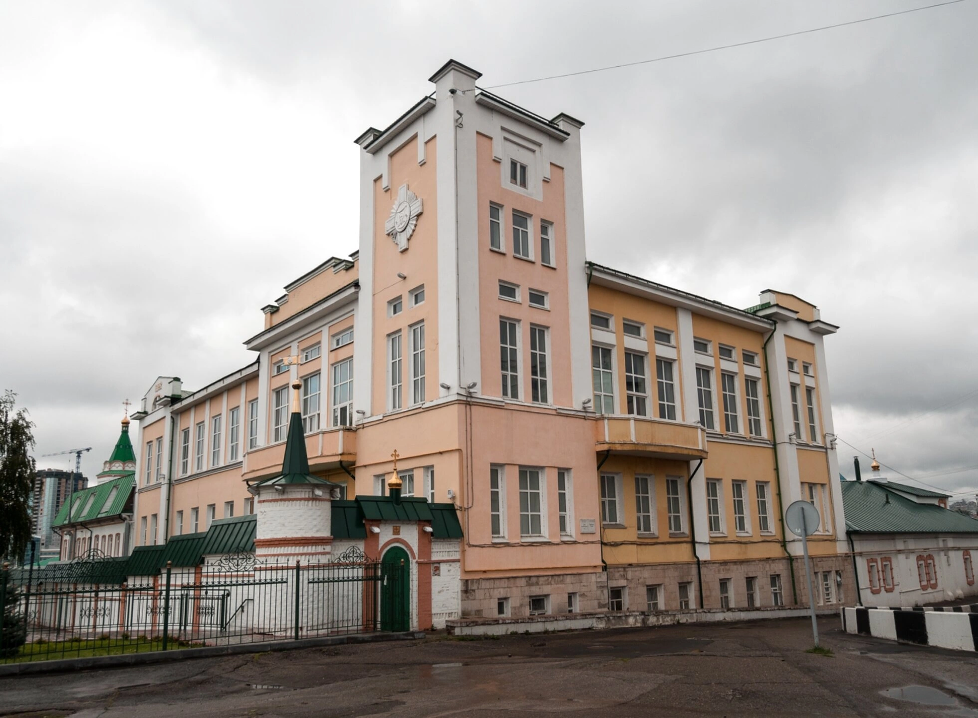На представленной фотографии запечатлено историческое здание, известное как Крестьянский дом, расположенное в пределах архитектурного комплекса Свято-Троицкого мужского монастыря в городе Чебоксары. Светло-желтый фасад строения, украшенный благородными белыми декоративными элементами и пилястрами, создаёт ощущение величия и спокойствия. Высокая центральная часть здания увенчана башней, на которой размещён декоративный элемент, подчёркивающий его особый статус.