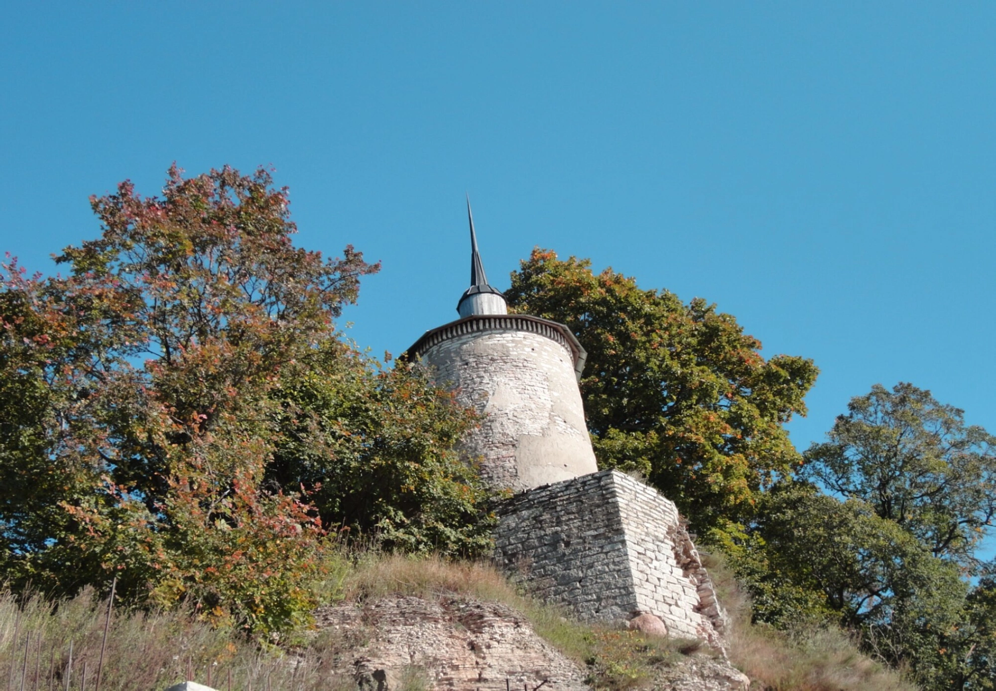 Круглая башня, изображённая на снимке, представляет собой классический образец древнерусского оборонного зодчества. Её мощные стены, сложенные из местного известняка, и лаконичная форма были предназначены для эффективного отпора врагу. Ныне башня, увенчанная деревянной шатровой кровлей, мирно возвышается среди зелени, напоминая о былом величии монастырской крепости.
