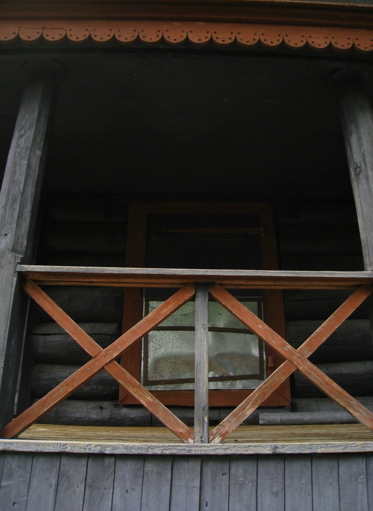 Ярким акцентом сооружения являются перила насыщенного красного цвета, украшенные крестообразным узором, символизирующим спасение и искупление. Конструкция выполнена из тёмных деревянных балок, чей почтенный вид свидетельствует о долгой истории святого места. Под карнизом взору открывается изящный резной фриз с повторяющимся орнаментом, характерным для православного церковного строительства.